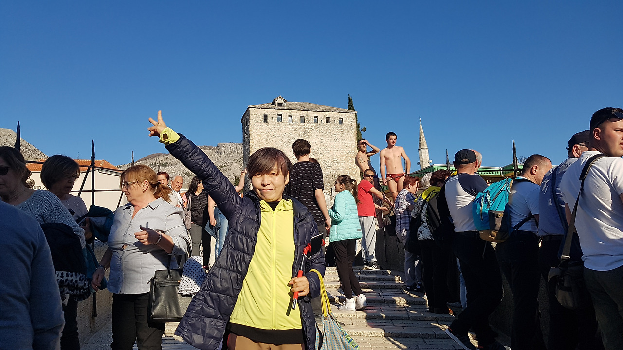 그럼에도 불구하고 많은 관광객들의 시선은 이 아름다운 다리 위에서 목숨을 걸고 다이빙하는 사람에게 몰려있다. 한 명은 다리 위에서 다이빙을 준비하고 다른 한 명은 다이빙 쇼를 원하는 관광객들로부터 돈을 걷고 있다. 적당한 돈이 모아지면 다이빙을 한다.