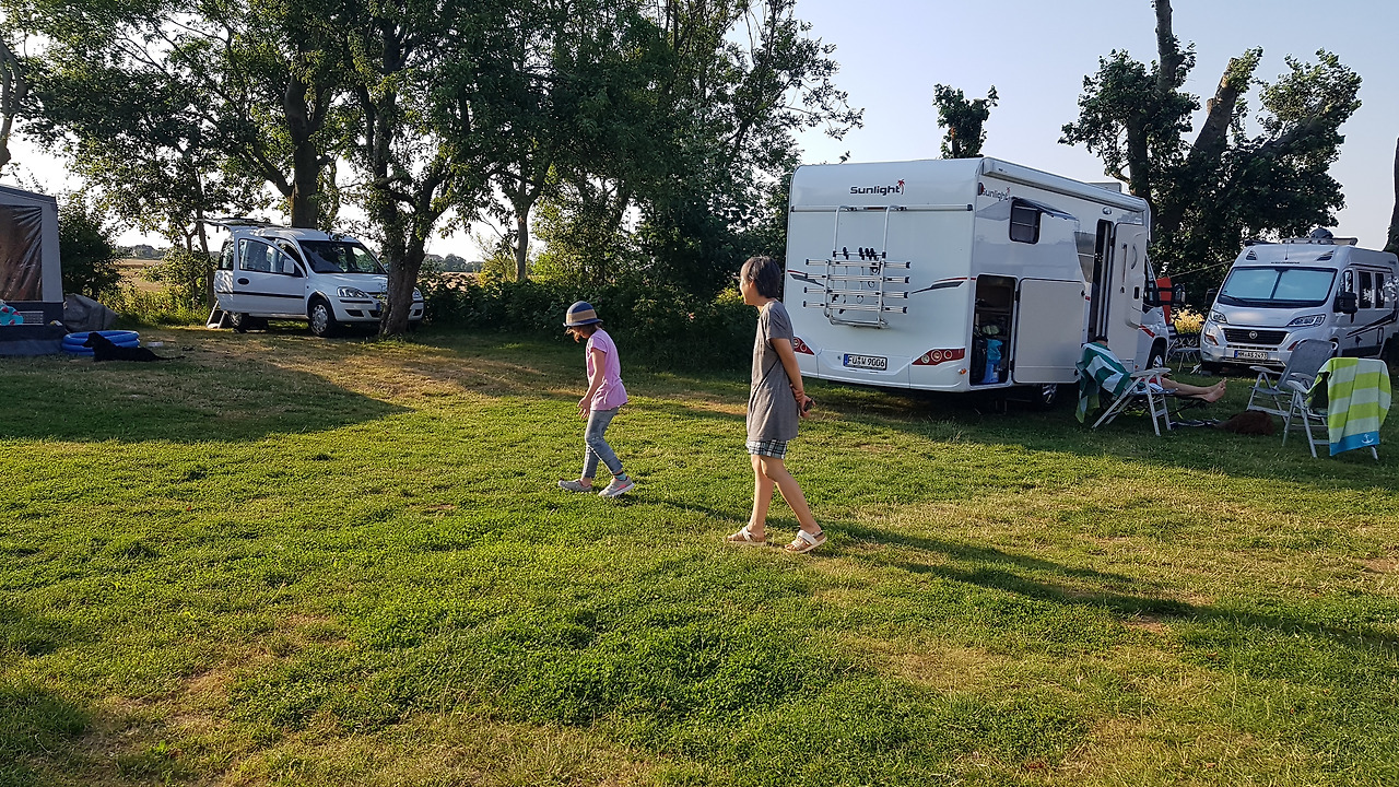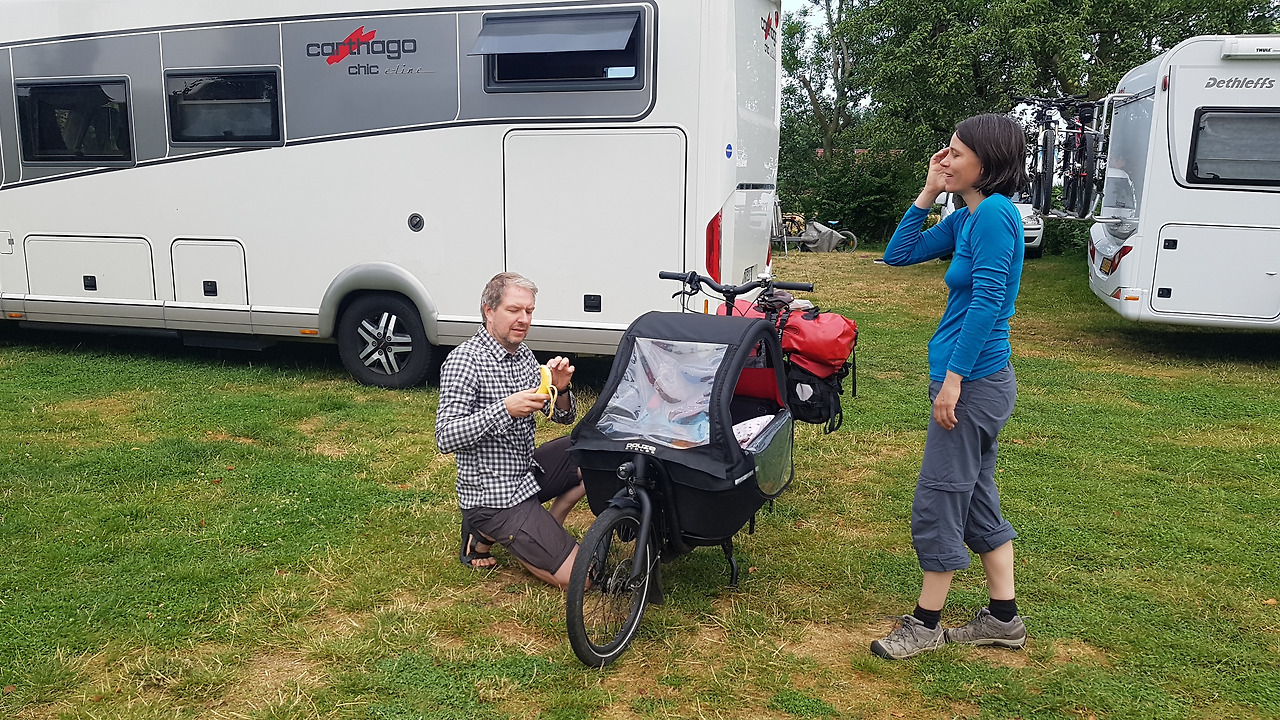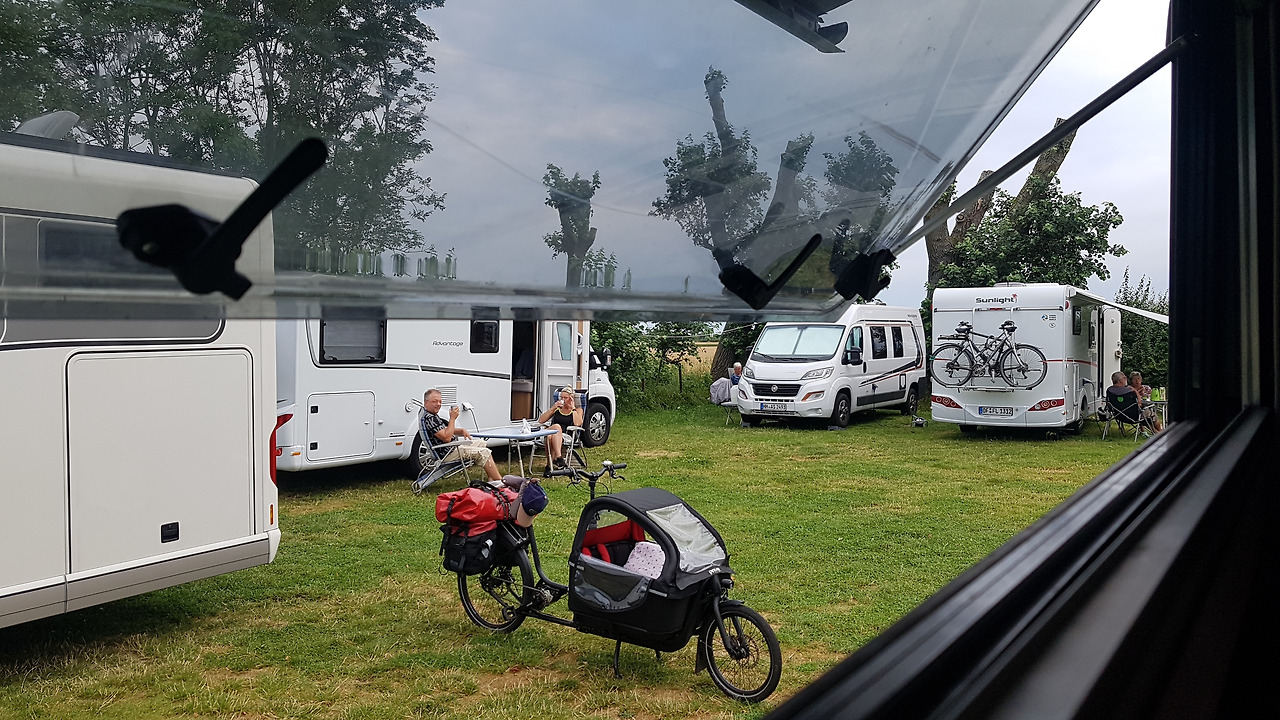 다음날 아침에 캠핑카 문을 여니 모닝커피를 즐기는 분들의 여유로운 모습도 보이고 애기를 태울 수 있는 자전거도 보인다. 작은 텐트 하나를 자전거에 싣고 아침은 바나나로 대체하고 출발하는 듯. 아마 이분들은 애를 데리고 자전거 여행을 하는데 숙박은 텐트에서 식사는 이렇게 간단하게 해결하거나 식당에서 사 드시는 듯하다. 대단한 독일인이다.