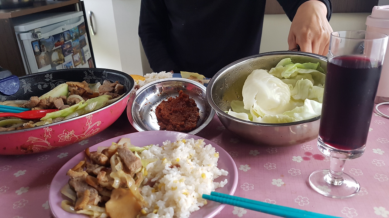 이날 저녁에는 캠핑카에 있는 음식을 최대한 소진하기 위한 만찬(?)을 즐겨야 한다. 이제 음식이 남으면 모두 버려야 한다. 아내 삶에 음식을 버리는 일은 용납되지 않는다. 철저한 계획 아래 음식 만들기와 정리 작업이 진행되었다. 그 덕분에 고기반찬에 와인과 소중한 된장에 채소 쌈까지 곁들인 호화로운 저녁이 준비되었다. 내일까지 이 음식이 남아있으면 쓰레기가 된다.