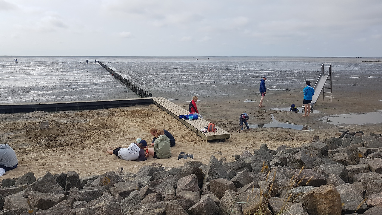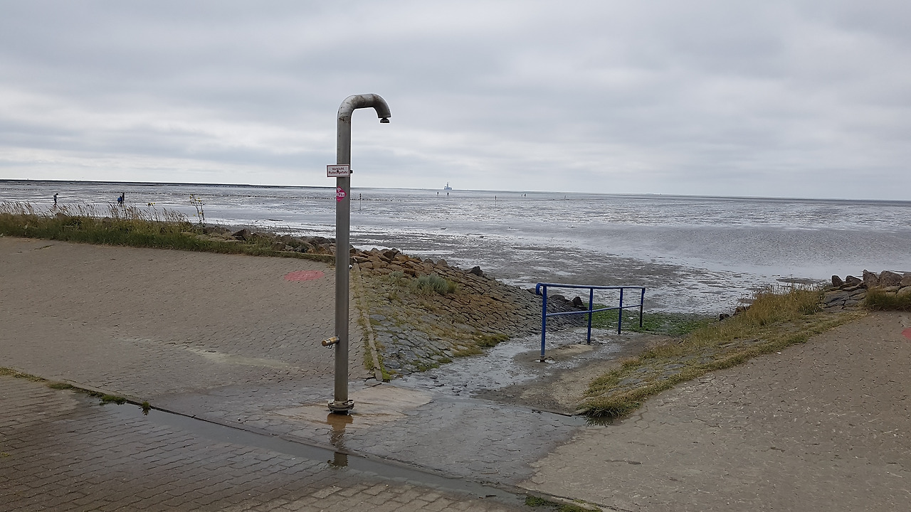 캠핑카 아톰의 자리를 정하고 나서 와덴 해 갯벌 유산을 구경하러 길을 나서본다. 캠핑장 앞에 있는 둔덕에 올라가면 한눈에 와덴 해 갯벌이 펼쳐 보인다. 넓은 갯벌을 바라보고 있으니 마음이 뻥 뚫리는 느낌. 한 1km 정도를 걷다 보니 방문객들이 많이 있는 구역이 나타난다. 자동차를 타고 오는 사람들을 위한 주차장과 이들을 상대로 하는 가계들도 보인다. 갯벌 유산 구역에서는 갯벌에 들어갔다 나오는 사람들이 씻을 수 있는 샤워시설도 보이고 소지품을 넣어서 보관할 수 있는 벤치가 보인다. 우리도 그 벤치에 앉아서 시원한 바다 바람을 즐겨본다. 그리고 갯벌에 들어갈 수 있는 구역이 별도로 정해져 있는 듯하다. 그리고 갯벌 관찰을 위해 인솔자를 따라서 갯벌에 들어갔다 오는 사람들도 보인다. 그러나 갯벌에서 채취를 하는 사람은 없다. 그냥 이런 풍경을 즐기는 것으로도 충분하다.