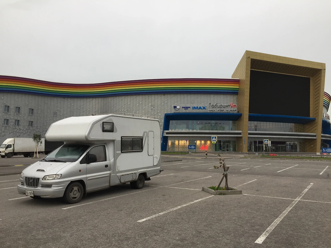 러시아 대도시인 쌍테 부르크에서는 도심 외곽에 있는 대형 쇼핑몰 주차장에 주차를 하였다. 이곳에서 2박을 정박했는데 문제를 삼는 사람은 아무도 없었다. 아침에 일어나 화장실을 무료로 이용할 수도 있었고 필요로 하는 물건을 사기에도 편리하였다. 그다음에는 인근에 있는 대형 공공시설의 주차장을 이용하였다.