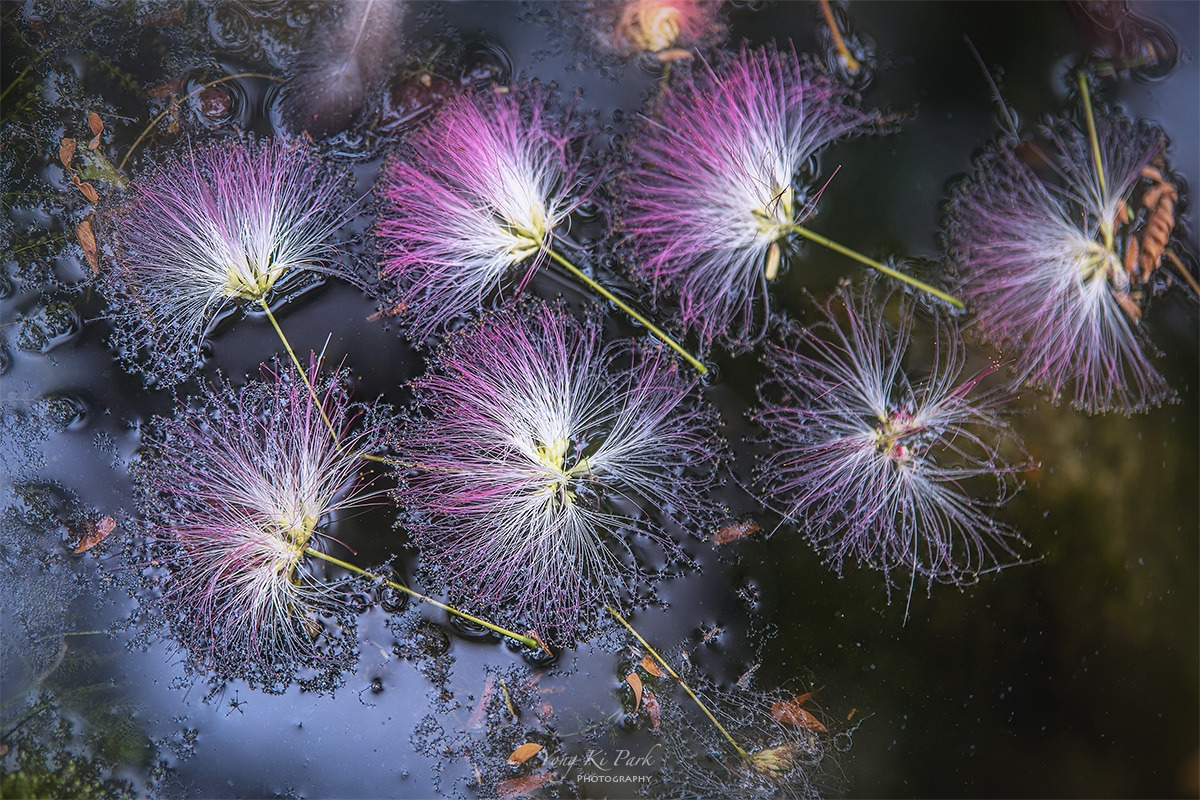 자귀나무 꽃들이 물 위에