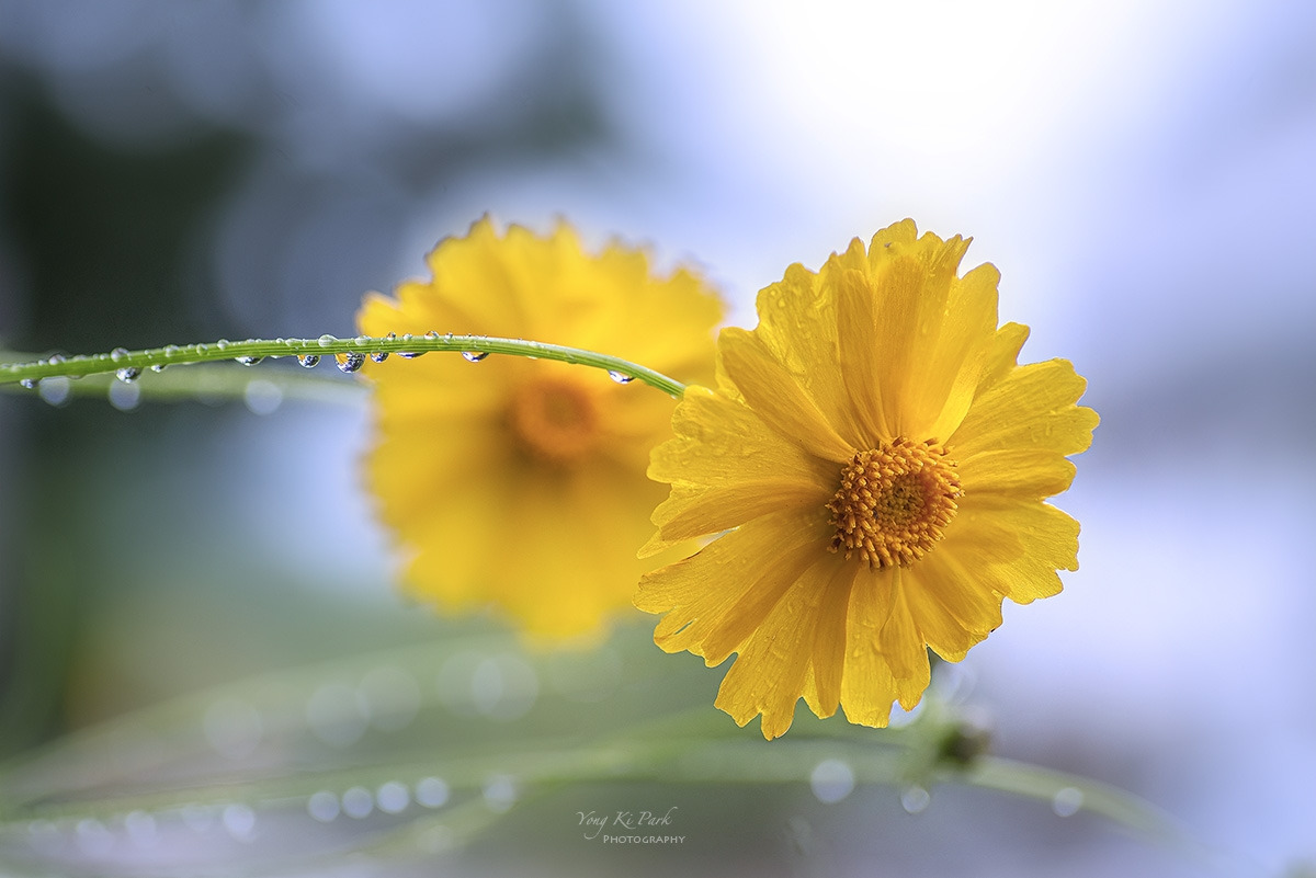 큰금계국 꽃대를 적신 빗방울들 속에