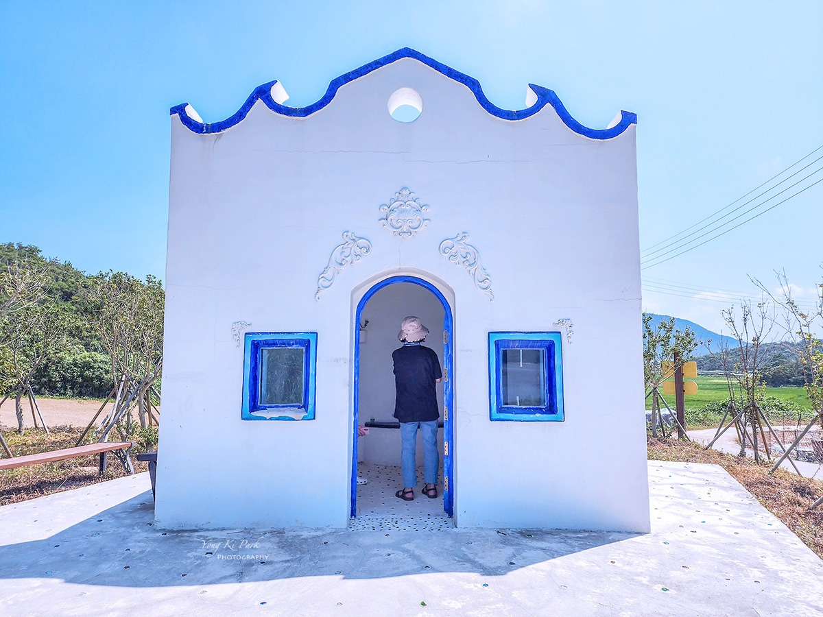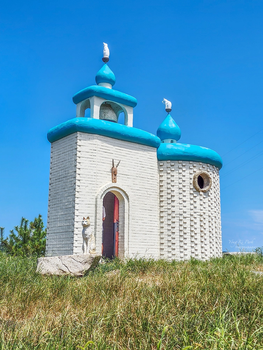 흰색 외벽과 푸른 돔의 아담한 건물은