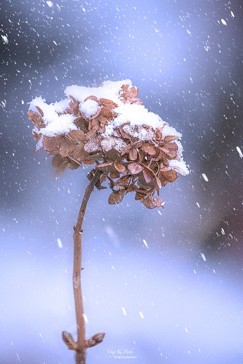눈에 덮여있는 수국의 마른 꽃을 보고 있노라니