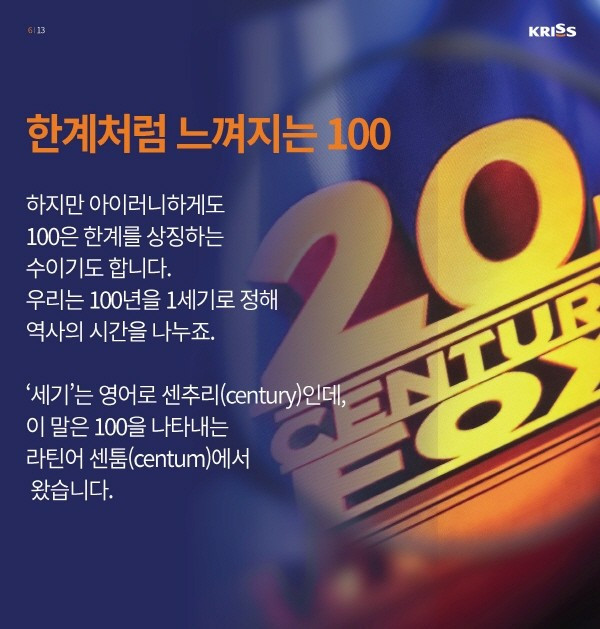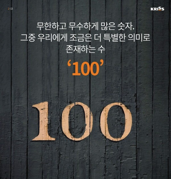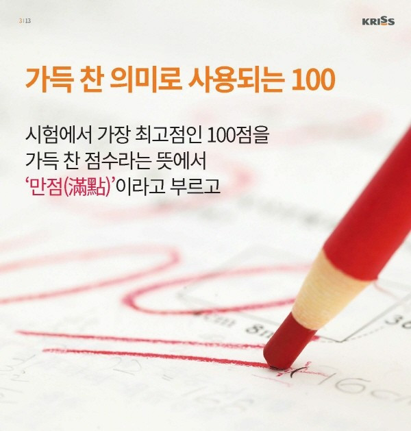 학교에서 돌아온 아이가 책가방 속에서 오늘 본 시험지를 꺼내어 자랑스러운 표정으로 부모 앞에 내놓는다. 시험지의 점수를 보면서 흐뭇한 미소를 지으며 모든 부모가 칭찬해 준다면 이 아이의 점수는 틀림없이 100점일 것이다. 우리는 이 점수를 만점(滿點)이라고도 부른다. 가득 찬 물 항아리에 더 이상 물을 부을 수 없는 상태와 같은 가득 찬 점수라는 의미다. 100이라는 숫자는 다양한 분야에서 우리에게 특별한 의미를 주는 숫자이다.