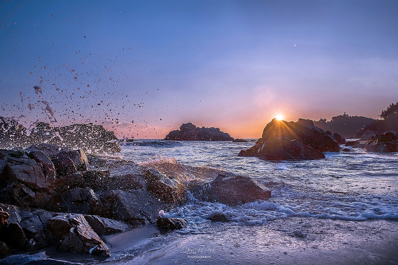 바위에 부딪혀 부서지는 파도의 파편과