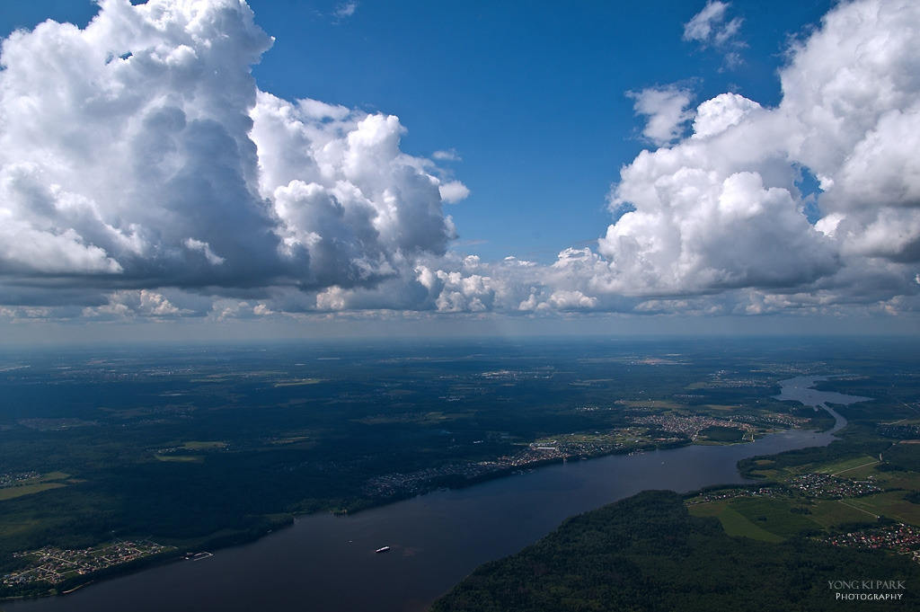하늘에서 바라본 아침 그리고 산과 강