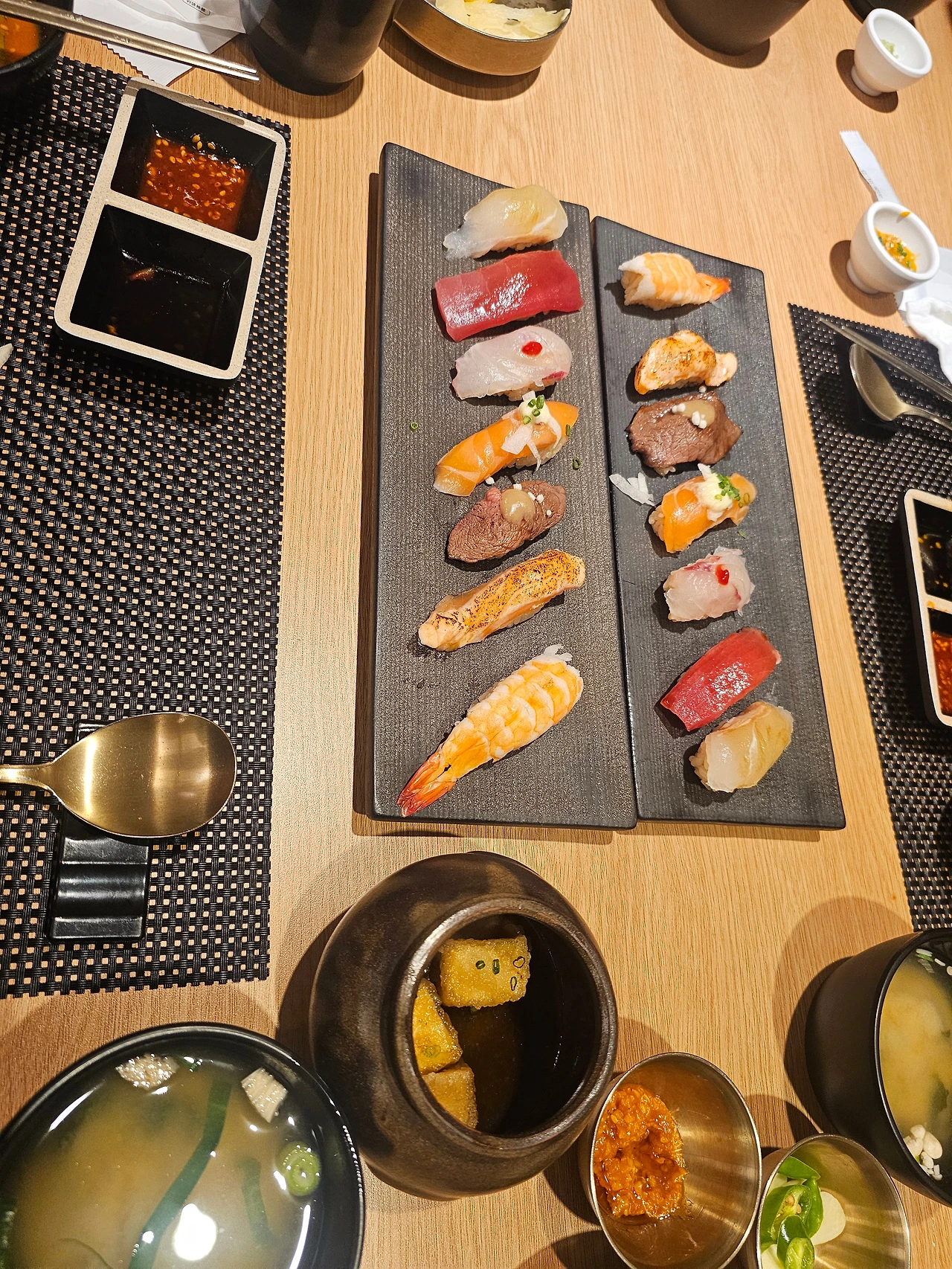 이어서 초밥이 나왔다. 요리사의 손길이 느껴지는 모양새였다. 한 점 한 점이 작은 작품처럼 보였다. 가족들은 각자의 초밥 7점을 하나하나 집어 들며 웃음을 나눴다. 살짝 톡 쏘는 고추냉이의 알싸한 향과, 생선회 특유의 쫄깃하면서도 부드럽게 씹히는 식감이 어우러지면 입안에서 조화가 환상적이었다. 감탄과 농담이 오가며 식탁은 점점 따뜻해졌다. 접시가 비워질 때마다 새로운 요리가 하나둘 테이블 위에 놓였고, 대화도 그만큼 풍성해졌다. 나는 조용히 웃으며 아내와 자식들의 이야기에 귀를 기울였다. 아내는 회를 좋아하지 않지만 오늘은 도전해 보겠다며, 예전에 회식 자리에서 먹었던 경험을 꺼내놓았다. 아들 또한 특별히 선호하는 회는 아니지만 분위기에 맞춰 함께 먹는다고 한다. 큰딸과 작은딸은 회만큼은 어떤 음식보다 만족스러운 표정을 지으며 밝은 목소리로 즐거운 분위기를 더했다. 사위도 자연스럽게 대화에 어울려, 자리에 한층 부드러운 온기를 불어넣었다.