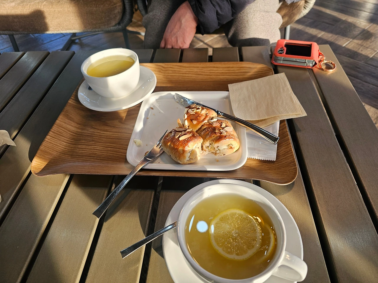 아내의 감기에 도움이 될 듯해 우리는 갓 데운 베이커리와 함께 따뜻한 수제 ‘생강차’를 주문했다. 잠시 후 직원이 조심스레 내려놓은 찻잔에서는 하얀 김이 천천히 피어올랐고, 그와 함께 은은한 생강 향이 공기 속으로 퍼지며 마음까지 부드럽게 감싸 안았다. 찻잔을 두 손으로 감싸 쥐자, 그 온기는 차를 넘기기도 전에 몸속 깊은 곳으로 스며드는 듯했다. 그리고 투명한 잔 위로 레몬 한 조각을 살며시 띄우니, 생강의 알싸함과 레몬의 산뜻함이 어우러져 은은한 향기가 공기 속에 고스란히 스며들었고, 그 향기마저 아내의 굳은 몸과 마음을 조심스레 풀어주는 듯했다. 우리는 오늘 하루 동안 쌓였던 피로와 염려가 조금씩 풀어지는 느낌이 들었다. 말없이 마주 앉아 차를 마시는 그 짧은 시간 동안, 오늘의 분주함과 걱정들은 마치 약속이라도 한 듯 잠시 자리를 비켜 주었다.