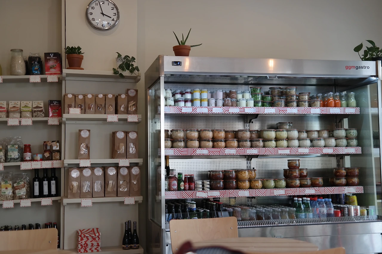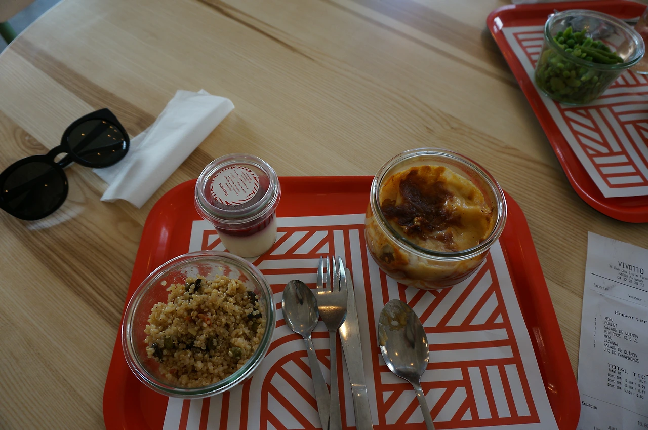 라벤더 투어를 2시쯤에 마치고 숙소에서 사진을 찍으며 1시간 가까이 놀다보니 시간이 애매해져서 열려있는 식당도 거의 없다. 점심도 그냥 숙소 근처에 열려 있는 식당 중 만만해 보이는 하나에 들어간다. 프랑스치고는 싼 가격에 주문 방식도 독특하다. 냉장고에 이미 전채(렌틸콩이나 퀴노아 샐러드 등)부터 본식(라자냐, 파스타, 리조토 등), 디저트(푸딩이나 산딸기 무스 같은 것)조리가 완료된 음식이 유리병에 담겨 있다. 손님이 메뉴를 정해서 그것을 트레이에 올려서 돈을 지불하면 직원이 그것을 전자레인지에 돌려서 데워 준다.
