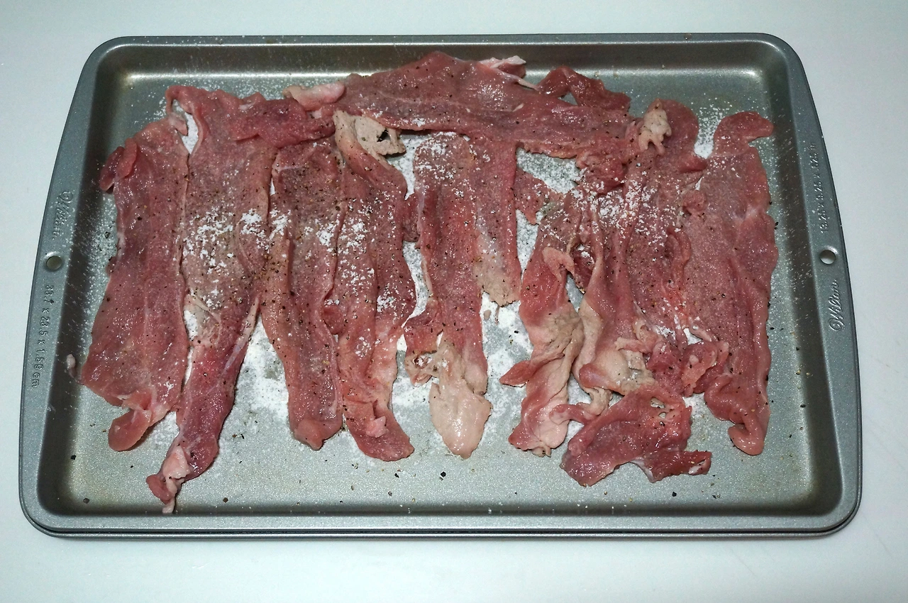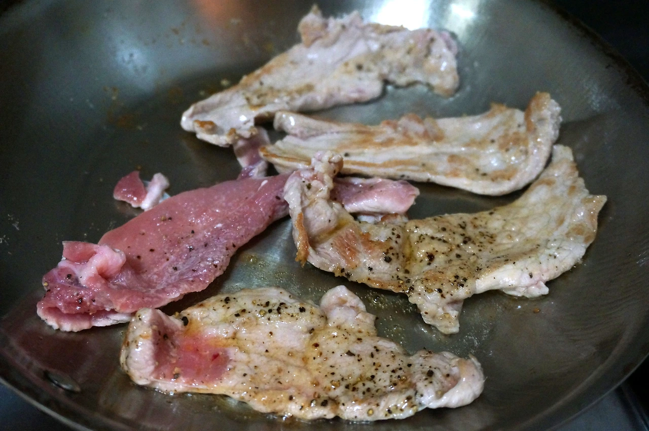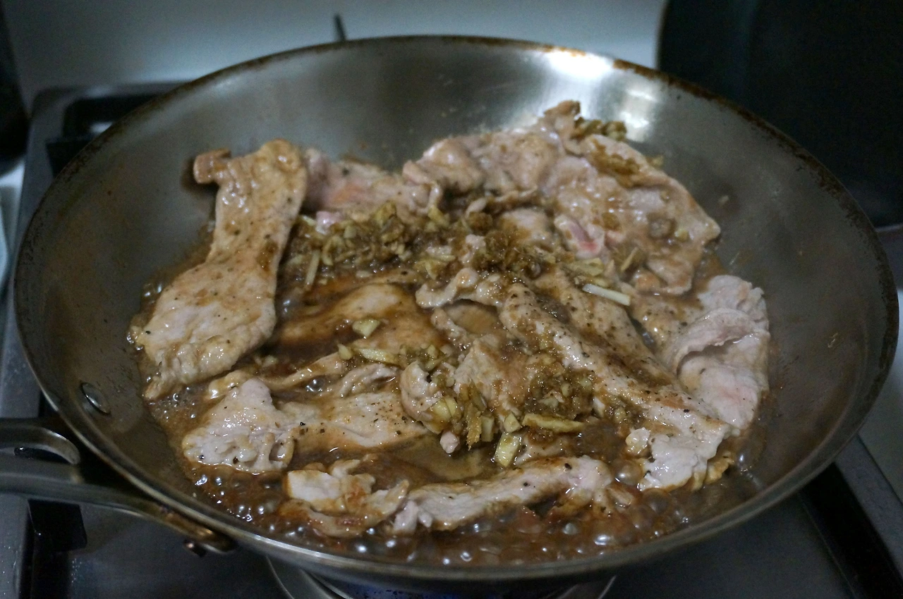 - 얇게 썬 손바닥만 한 크기의 돼지고기 4 조각(약 200g) (원래 쇼가야키에는 지방과 살코기가 적절히 섞인 등심이나 삼겹살 부위를 주로 사용하는데, 나는 집에 뒷다리살만 잔뜩 있었으므로 뒷다리살을 사용해야 했다. 뒷다리살을 사용할 때는 고기를 너무 많이 익히지 않도록 주의를 기울여야 한다. 지방이 적으므로 고기가 쉽게 뻣뻣해지기 때문이다)