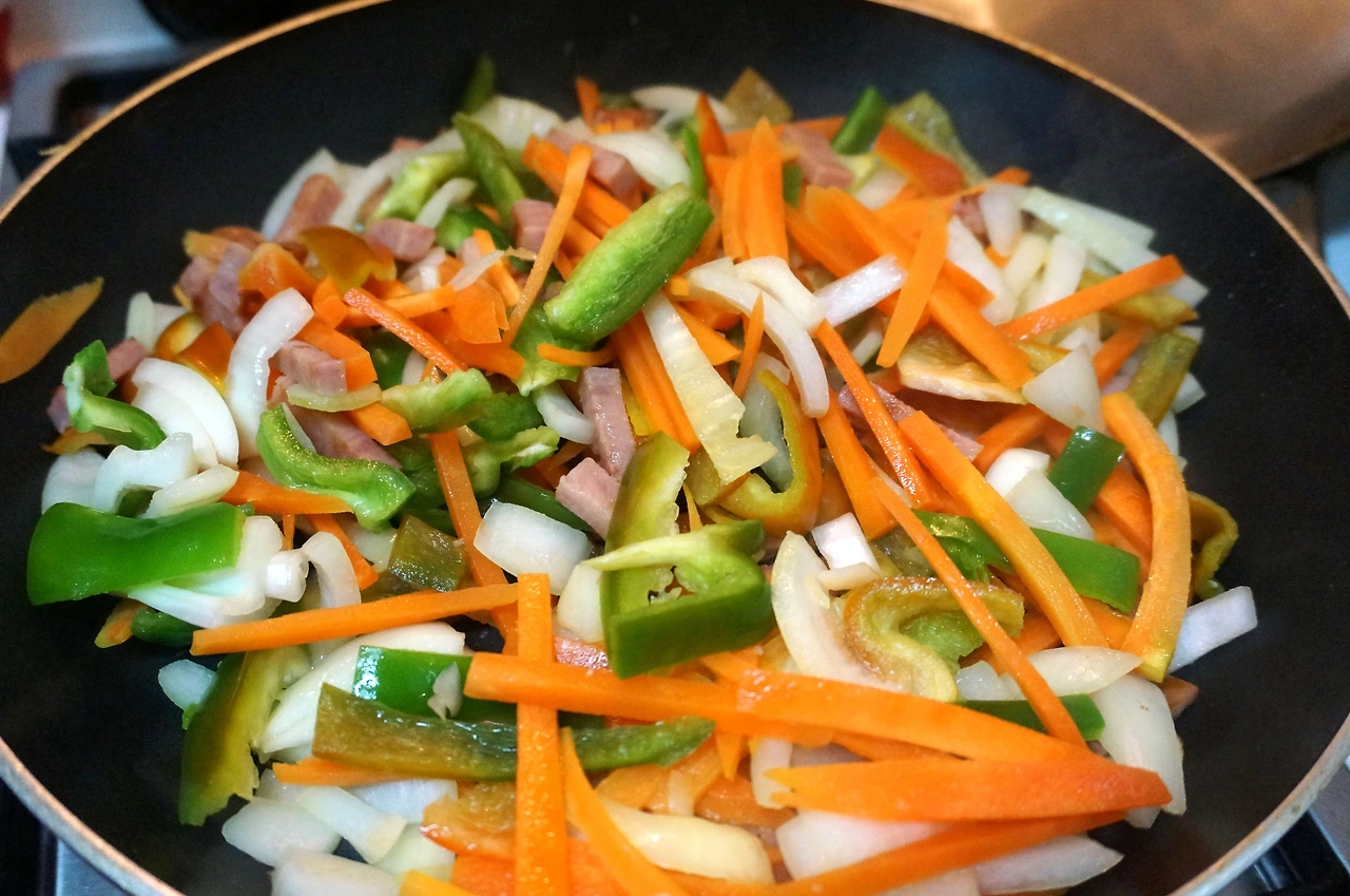2) 팬에 기름을 두르고 햄을 볶다가 숙주나 양배추 등 여린 채소를 제외한 채소를 넣고 볶는다.
