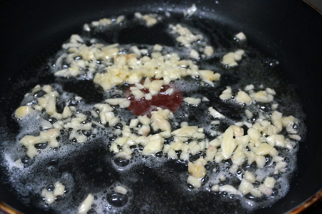 1) 팬에 기름을 두르고 손질한 마늘을 넣는다.