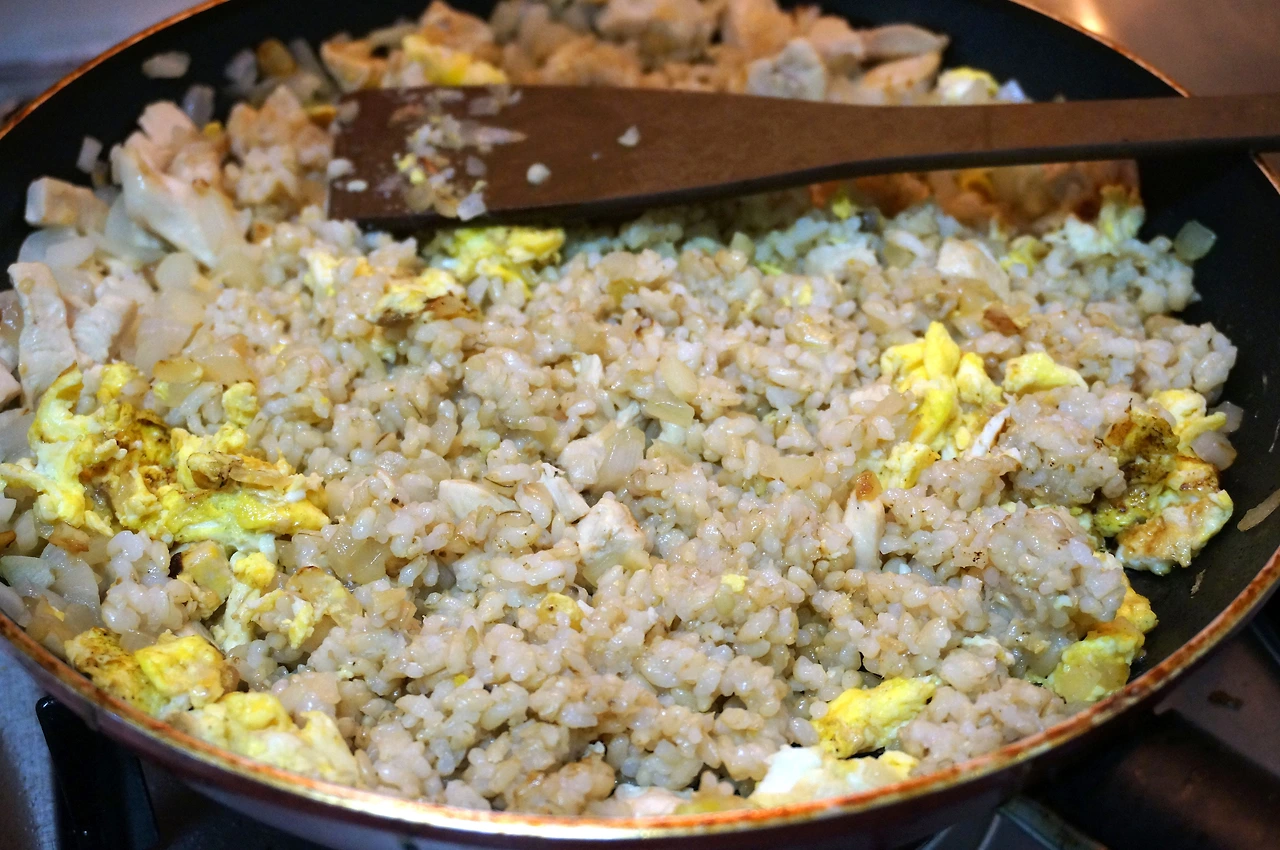 중국의 차오판과 유사한 모습이다. 달걀과 다진 소시지, 간장 등을 넣어서 만든다.