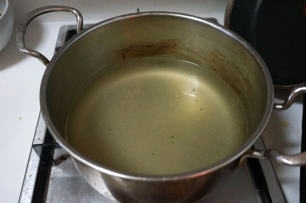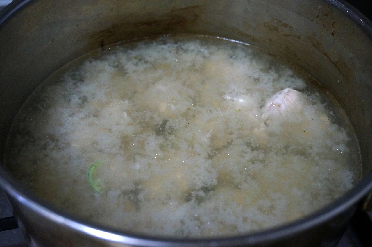 4) 준비한 닭 육수 또는 고형 치킨스톡을 물에 푼 것을 끓인다.