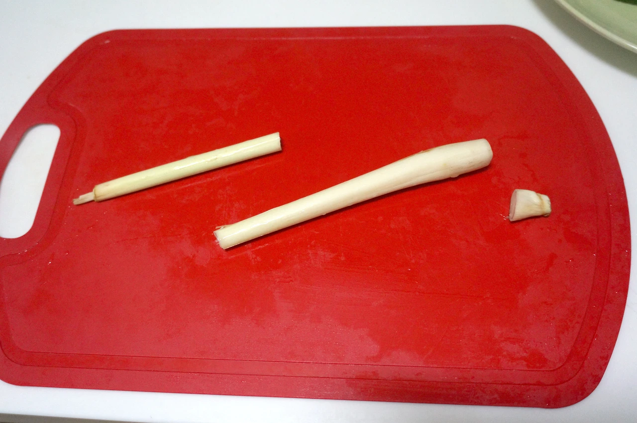 1) 레몬그래스는 맨 아랫부분과 억센 윗부분을 잘라낸 후, 중간 부분의 질긴 바깥 껍질을 벗겨서 준비한다. 레몬그래스 특유의 향은 중간 부분이 가장 강하다고 한다. 칼등으로 레몬그래스 줄기를 골고루 치는 것으로 레몬그래스 준비를 마무리한다. 향이 국물에 더 잘 우러나게 하기 위한 것이다.