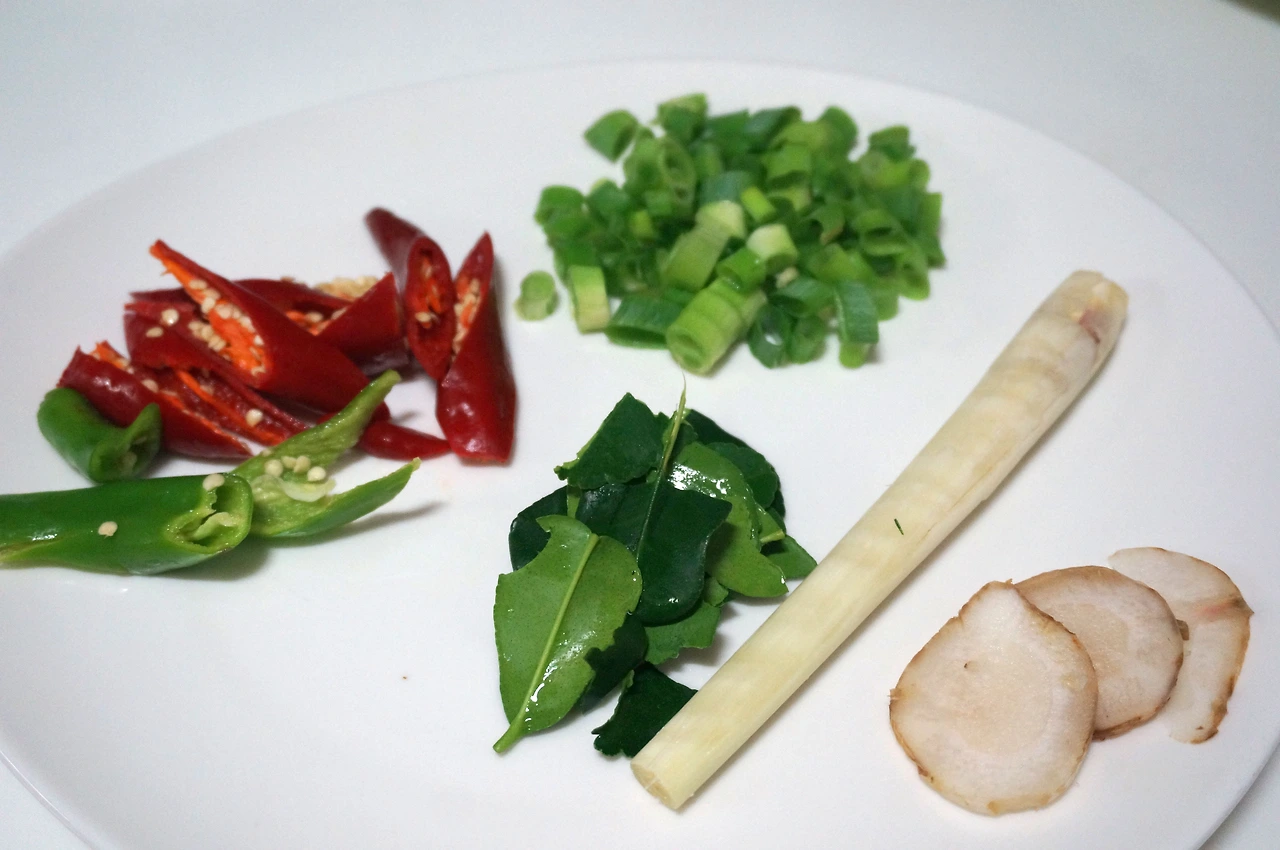 - 레몬그래스 1 줄기, 카피르 라임 잎 4~5 장, 둥글게 썬 갈랑갈 5~10 편