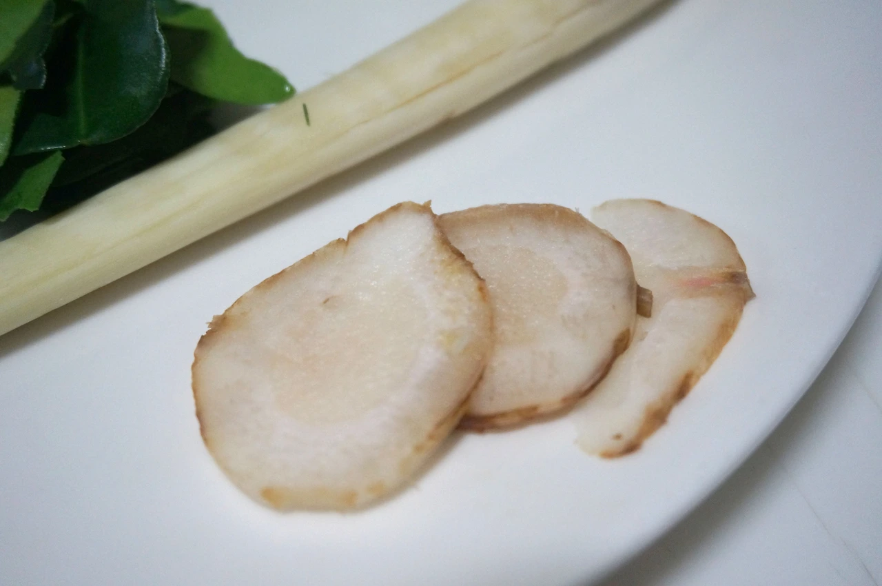 2) 갈랑갈은 얇게 편을 썰고, 카피르 라임 잎은 손으로 두어 번 찢는다. 고추는 칼등으로 내리치거나 어슷하게 썬다. 모두 재료의 향이 국물에 잘 우러나게 하기 위한 준비과정이다.