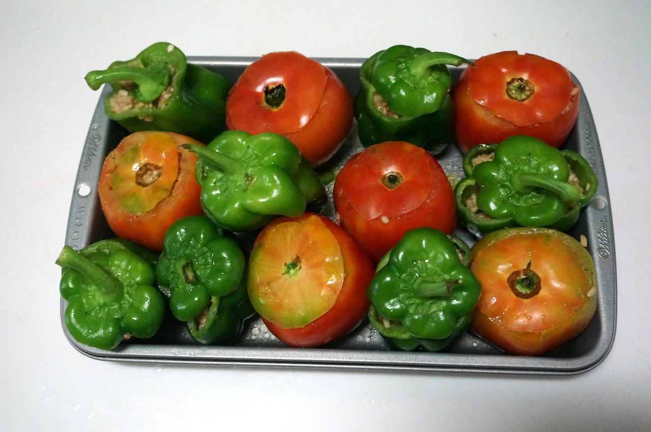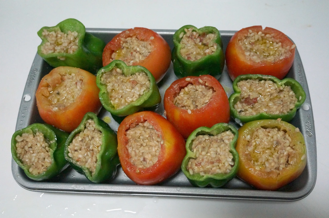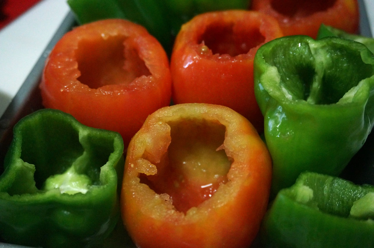 3. 속을 비운 토마토와 피망에 (2)의 속재료를 집어넣는다. 쌀이 익으면서 부피가 커질 것을 고려해 너무 가득 담지 않는다.