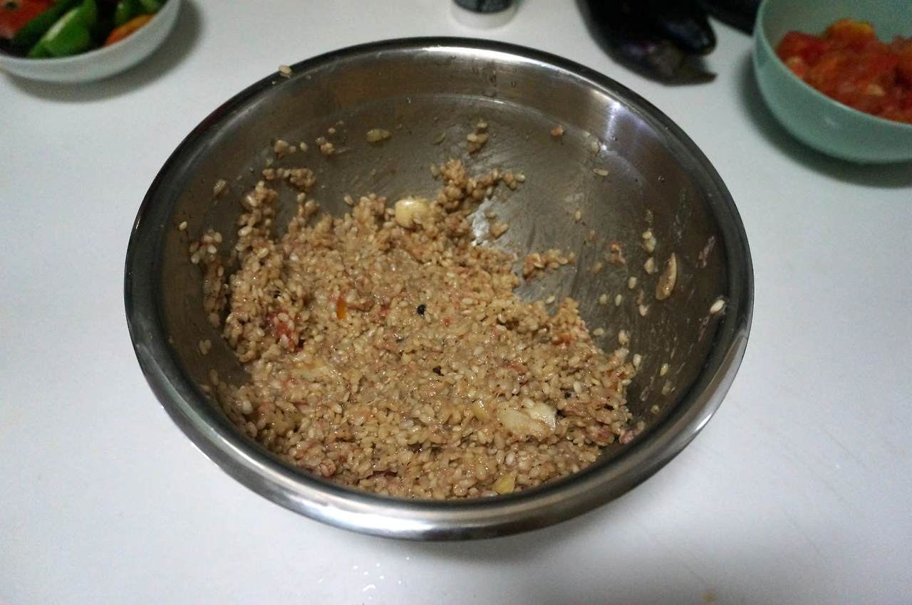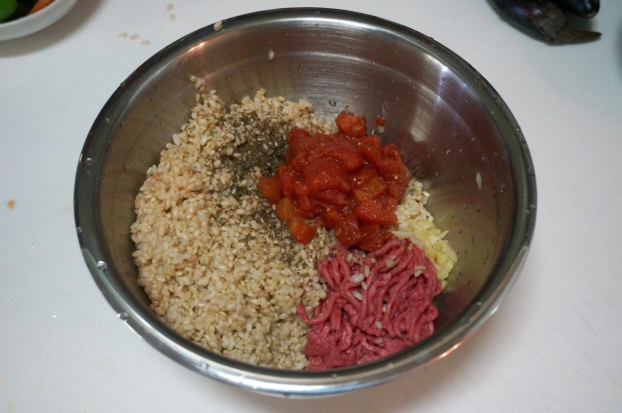 2. 불려서 살짝 익힌 쌀, 소고기, 토마토 페이스트(토마토 캔보다는 진하게 농축된 페이스트가 더 낫다), 다진 마늘, 민트, 소금, 후추를 고루 섞는다. 비율은 취향에 맞게 조절한다.