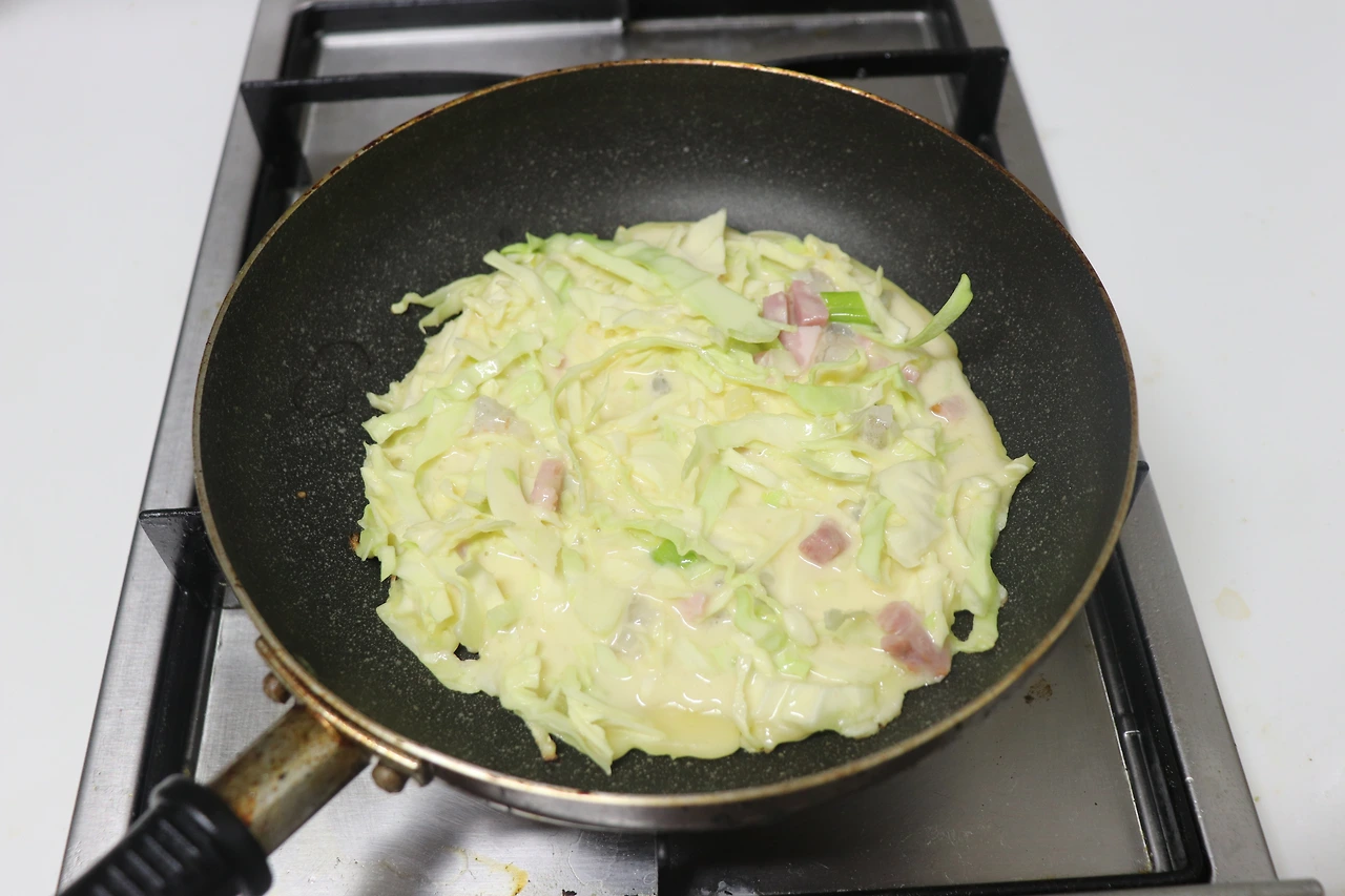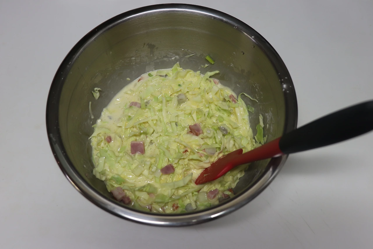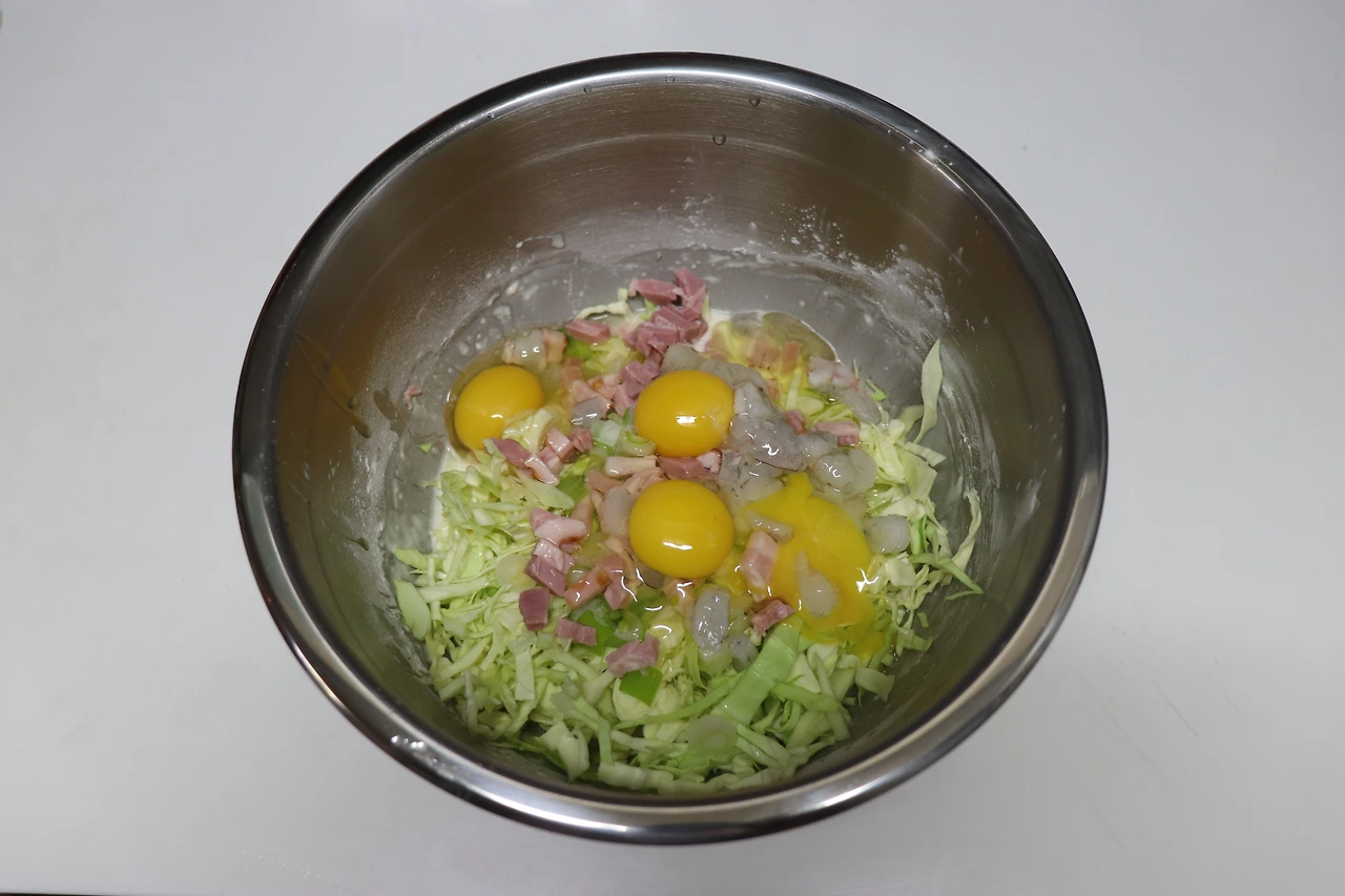 4. 반죽에 양배추, 대파, 달걀, 베이컨, 새우 등을 넣고 잘 섞는다.
