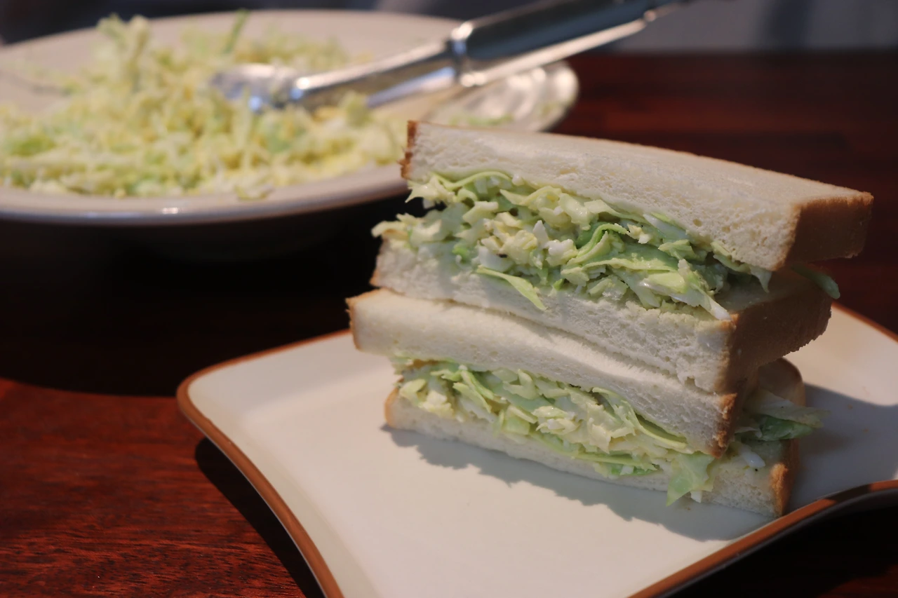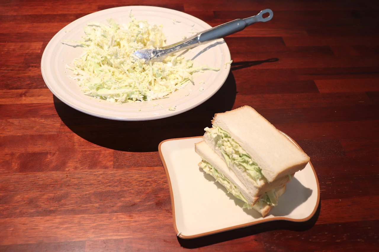 4. 샌드위치 빵 두 개 사이에 양배추 속을 넣고 반으로 자른다.