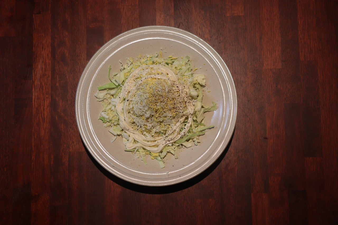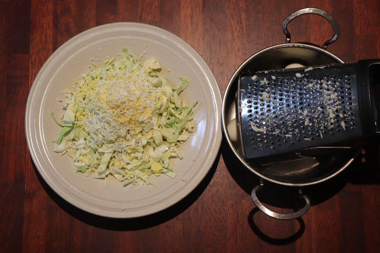 2. 삶은 달걀을 강판에 갈아 양배추 위에 올린다.