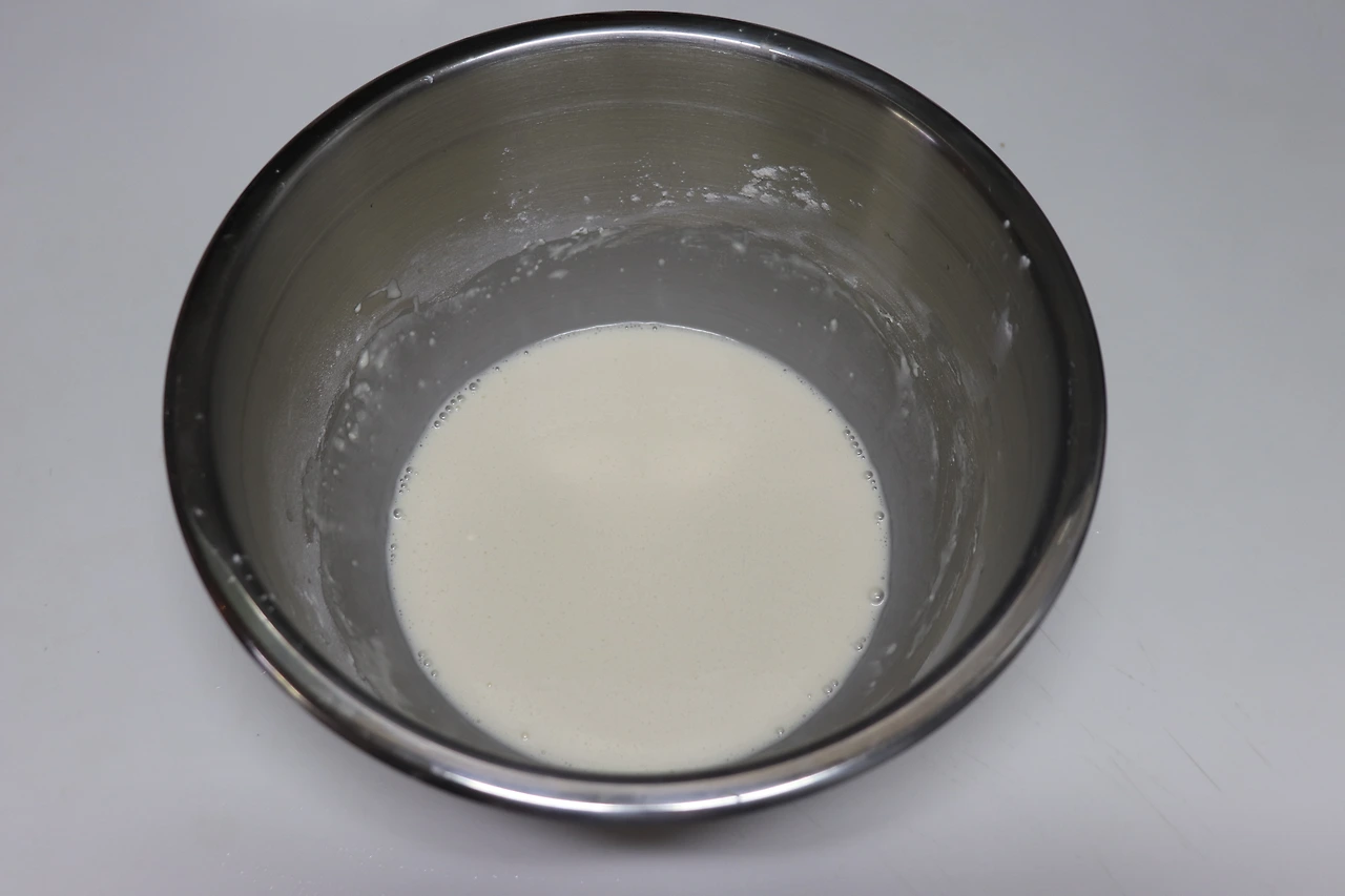 2. 해물다시를 푼 물을 밀가루에 조금씩 넣어가며 덩어리 지지 않도록 잘 섞는다(전분을 사용한다면 해물다시를 조금 남겨둔다).