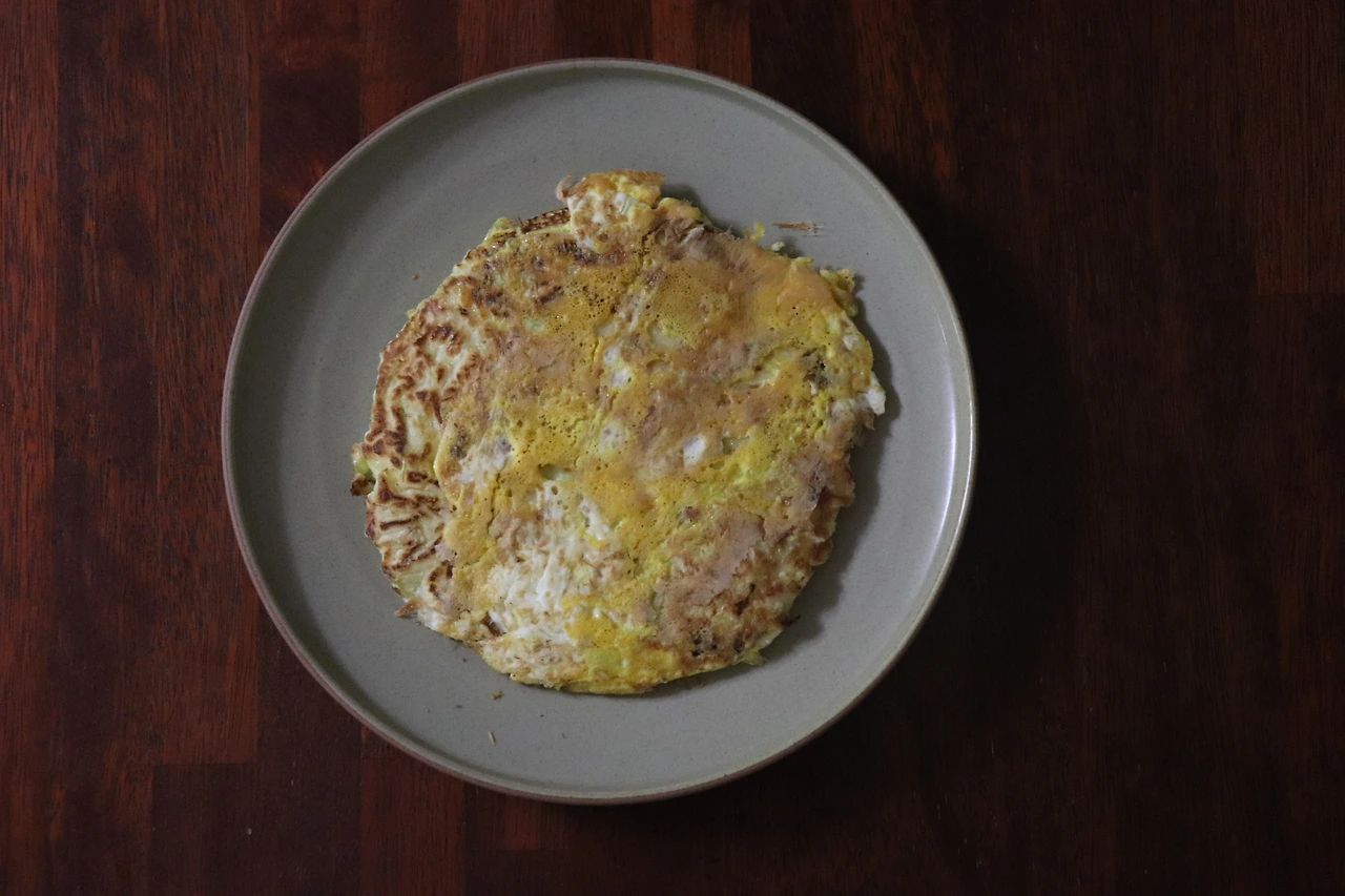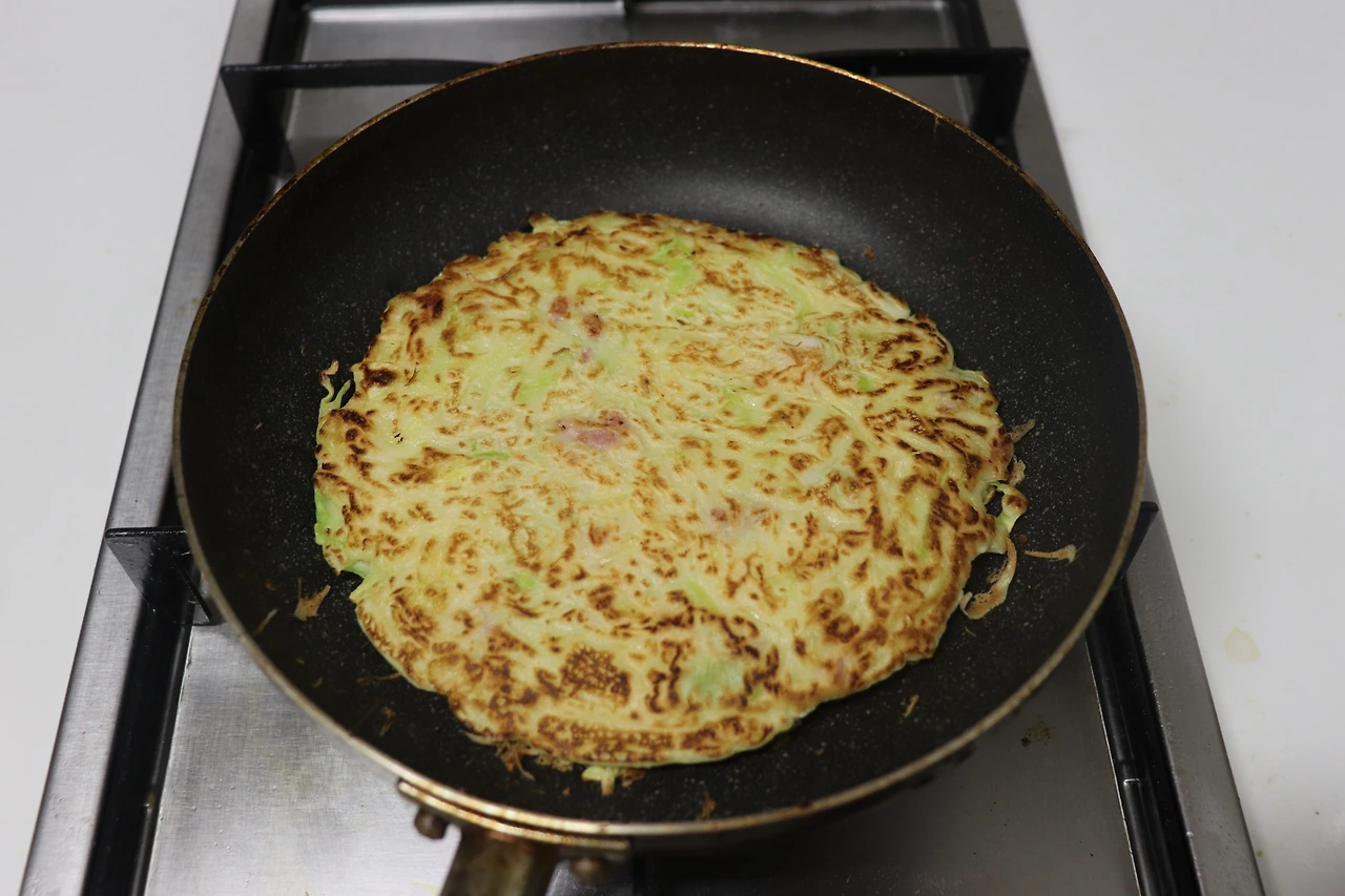 6. 양면이 고루 익으면 반죽을 잠시 치운 팬 바닥에 달걀을 얹고 위에 반죽을 덮어 익힌다.