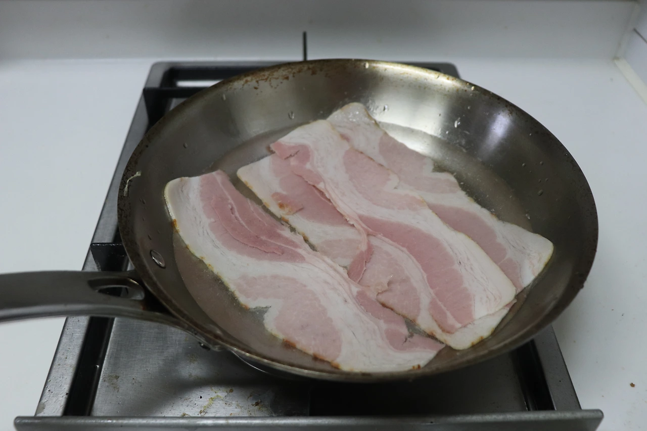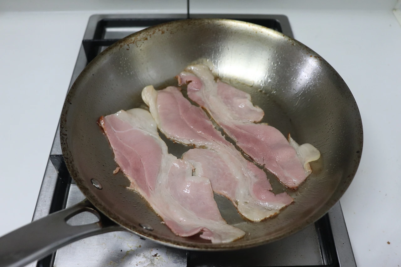 1) 중약불로 예열한 팬에 베이컨을 나란히 올린다. 베이컨 자체에 기름이 충분하므로 기름을 두를 필요는 없다. (코팅 팬이 아닌 스테인리스 팬을 사용한다면 시즈닝을 위해 약간의 기름을 발라둘 필요는 있다)
