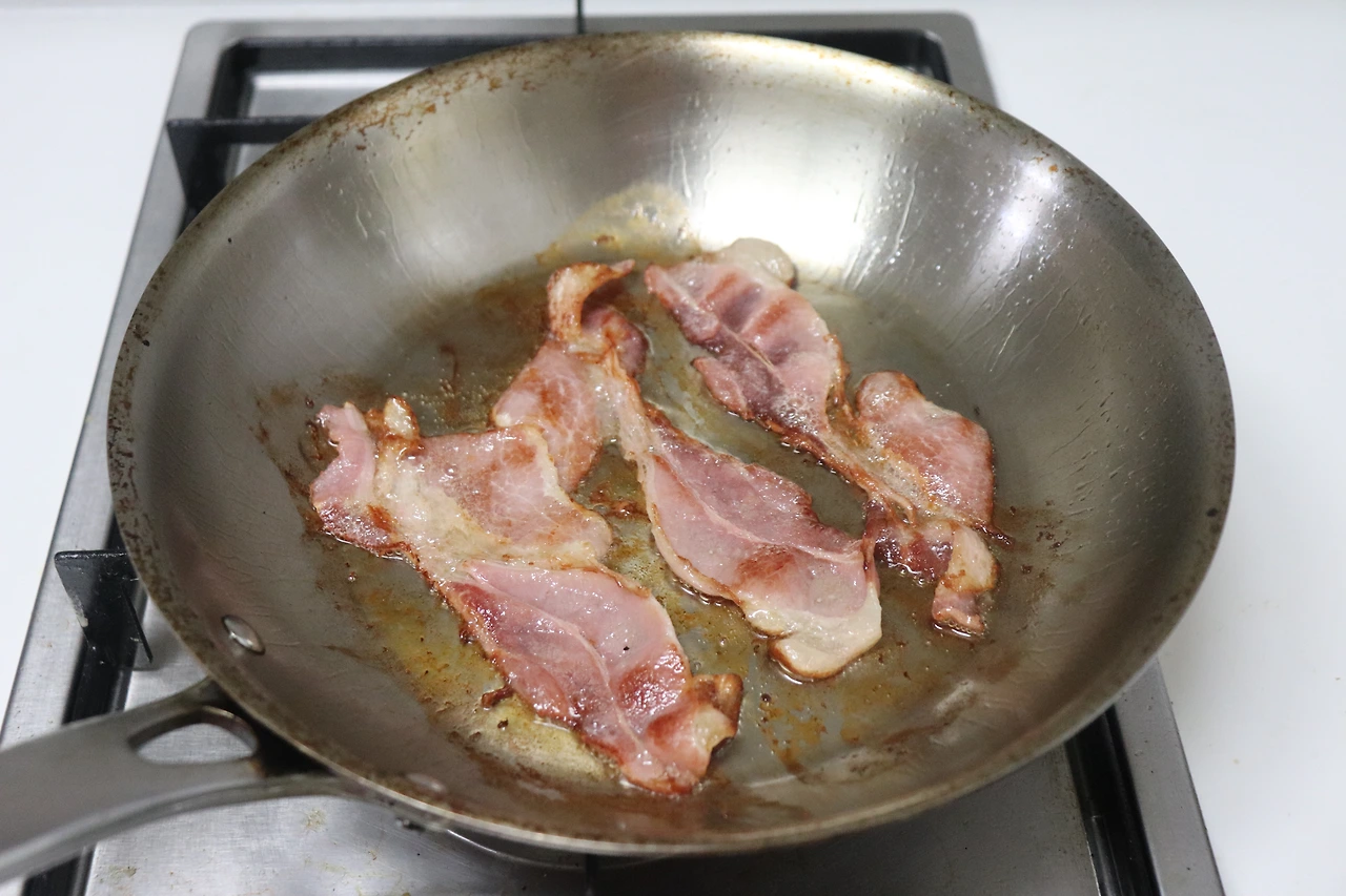2) 강한 불에 빠르게 익히면 베이컨이 급격하게 수축할 수 있으므로 중약불을 유지하며 굽는다. 베이컨에서 빠져나온 기름에 베이컨을 다시 튀기는 느낌으로 굽는다.