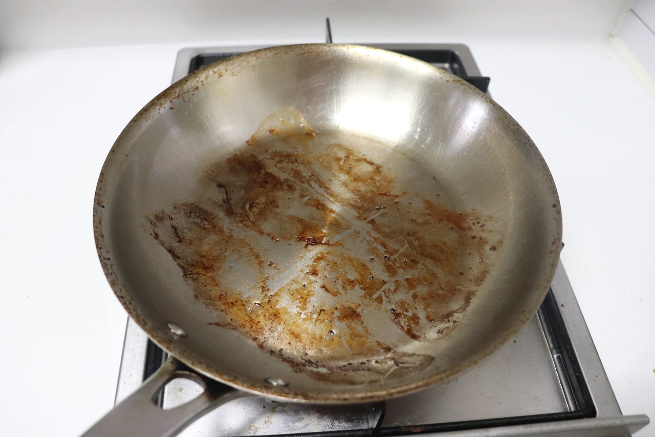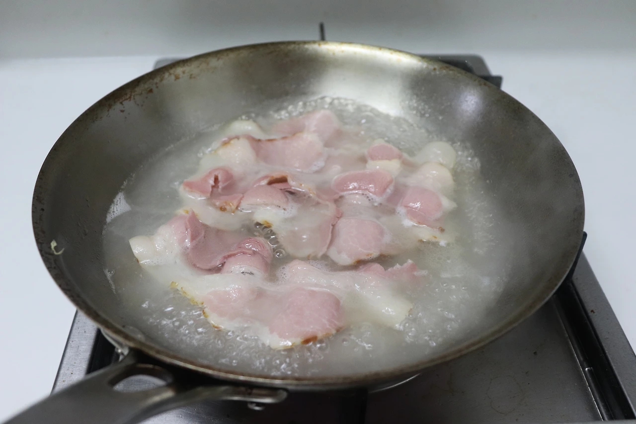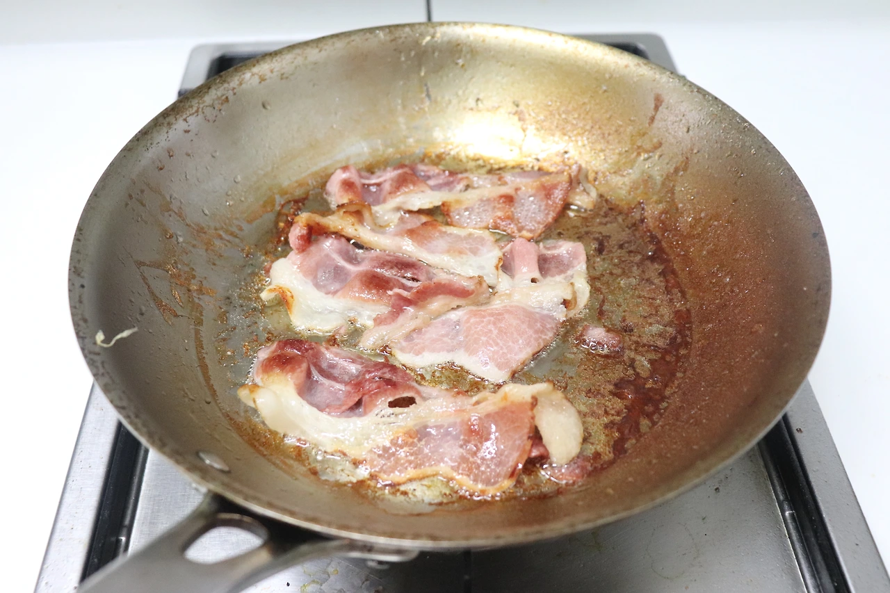 2) 물이 대부분 졸아들 때까지(약 15~20분 정도가 걸린다) 물을 끓인다. 물이 거의 다 졸아들면 팬 바닥에는 베이컨 기름만 남는데, 이때 베이컨을 뒤집어가며 고루 익힌다. 너무 타기 전에 팬에서 꺼낸다.