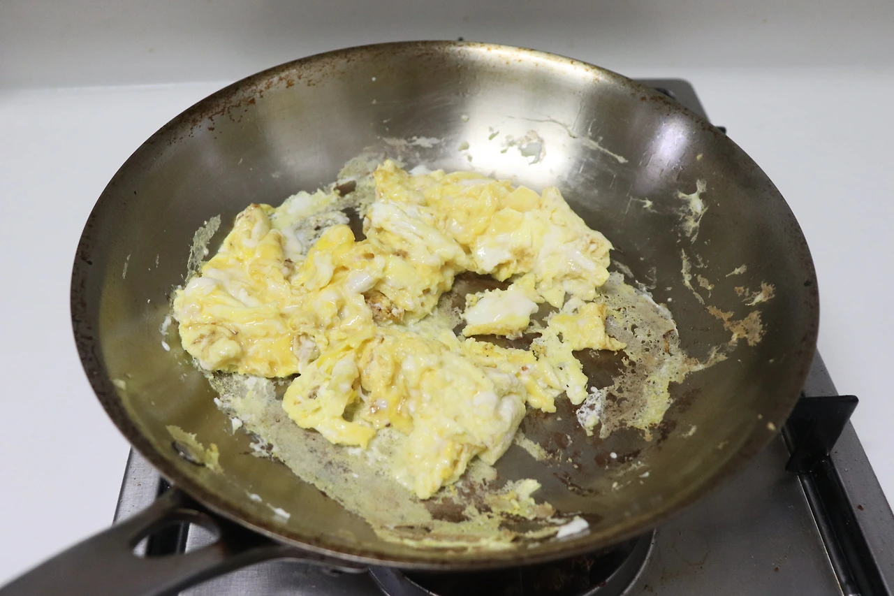 3) 베이컨 기름이 남아있는 팬에 스크램블드 에그를 만든다.