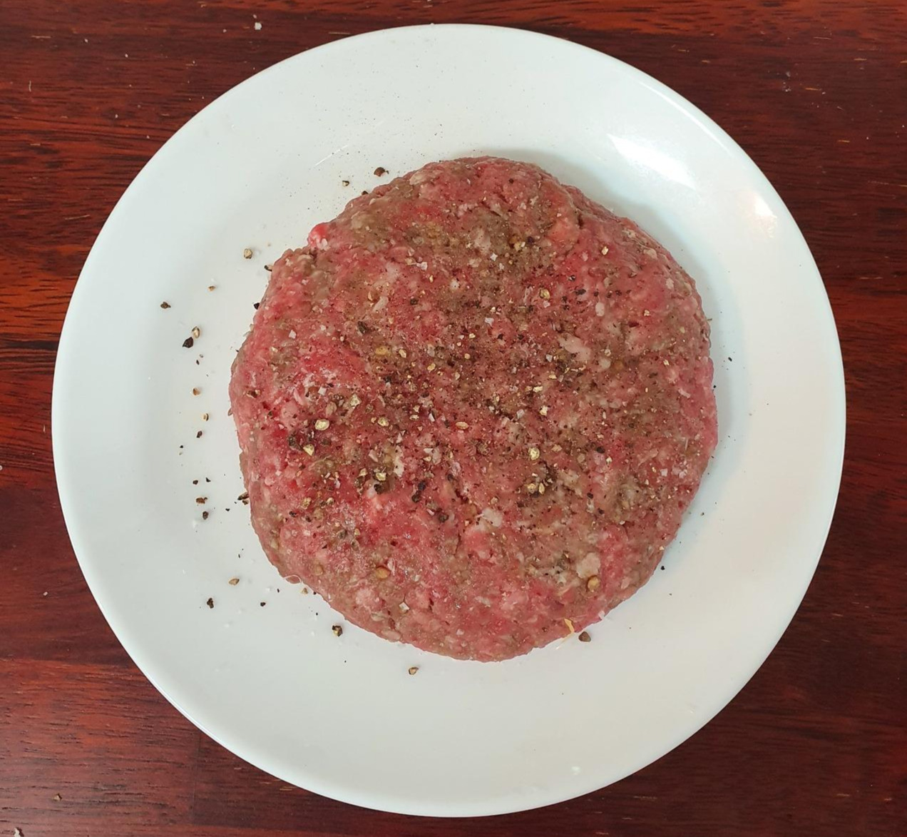 (1) 다진 소고기를 뭉친다. 팬에 굽기 직전에 겉면에 소금, 후추 간을 넉넉하게 한다. 굽기전에 가운데를 움푹하게 살짝 눌러주면 팬에서 고기가 수축해도 평평한 형태가 유지된다.