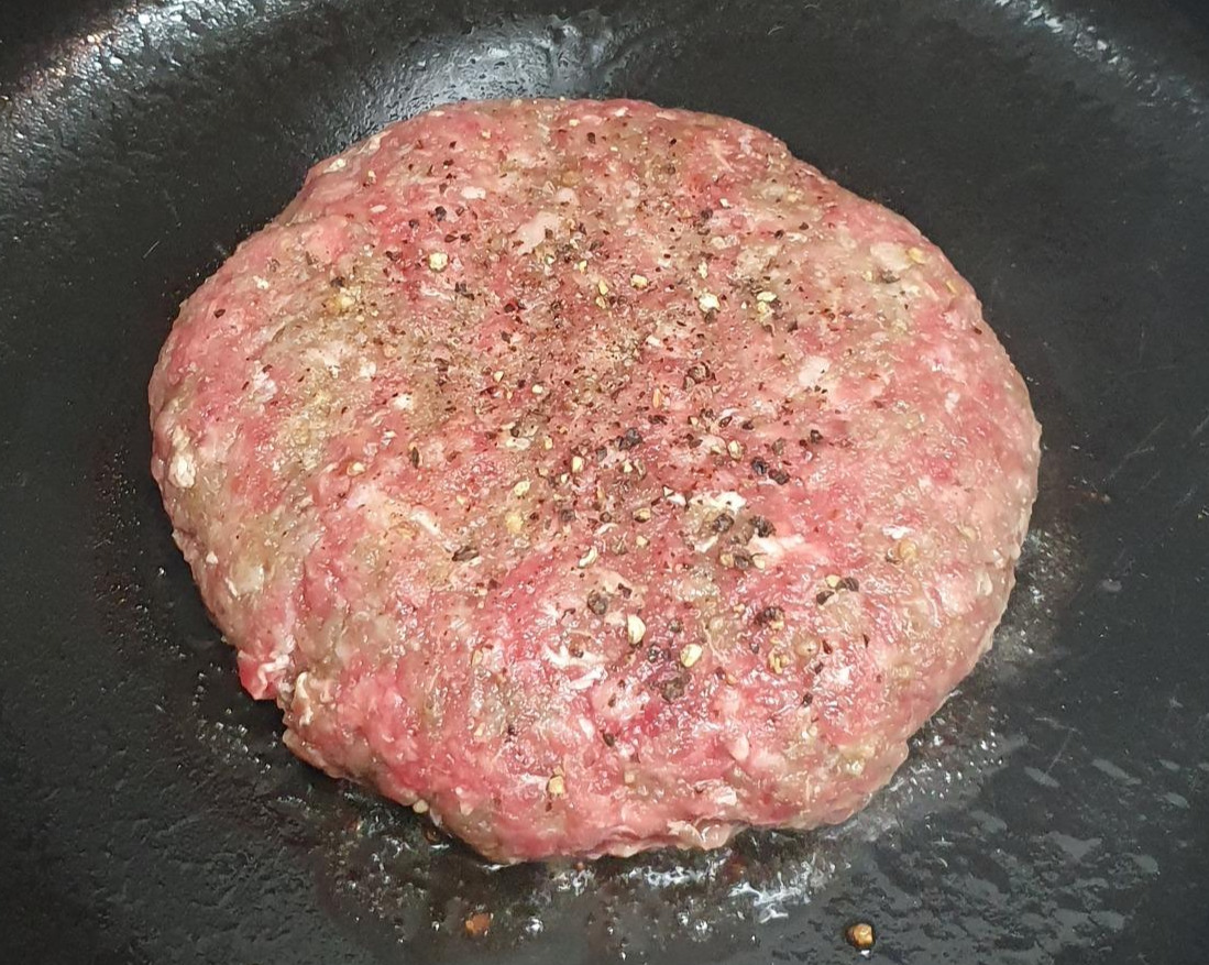(2) 잘 달군 팬(무쇠 팬이나 스테인레스 팬 추천)에 오일을 두르고 소고기 패티를 올린다. 한면이 다 익어서 고기가 표면에서 잘 떨어질 때쯤 뒤집어서 양면을 익힌다.