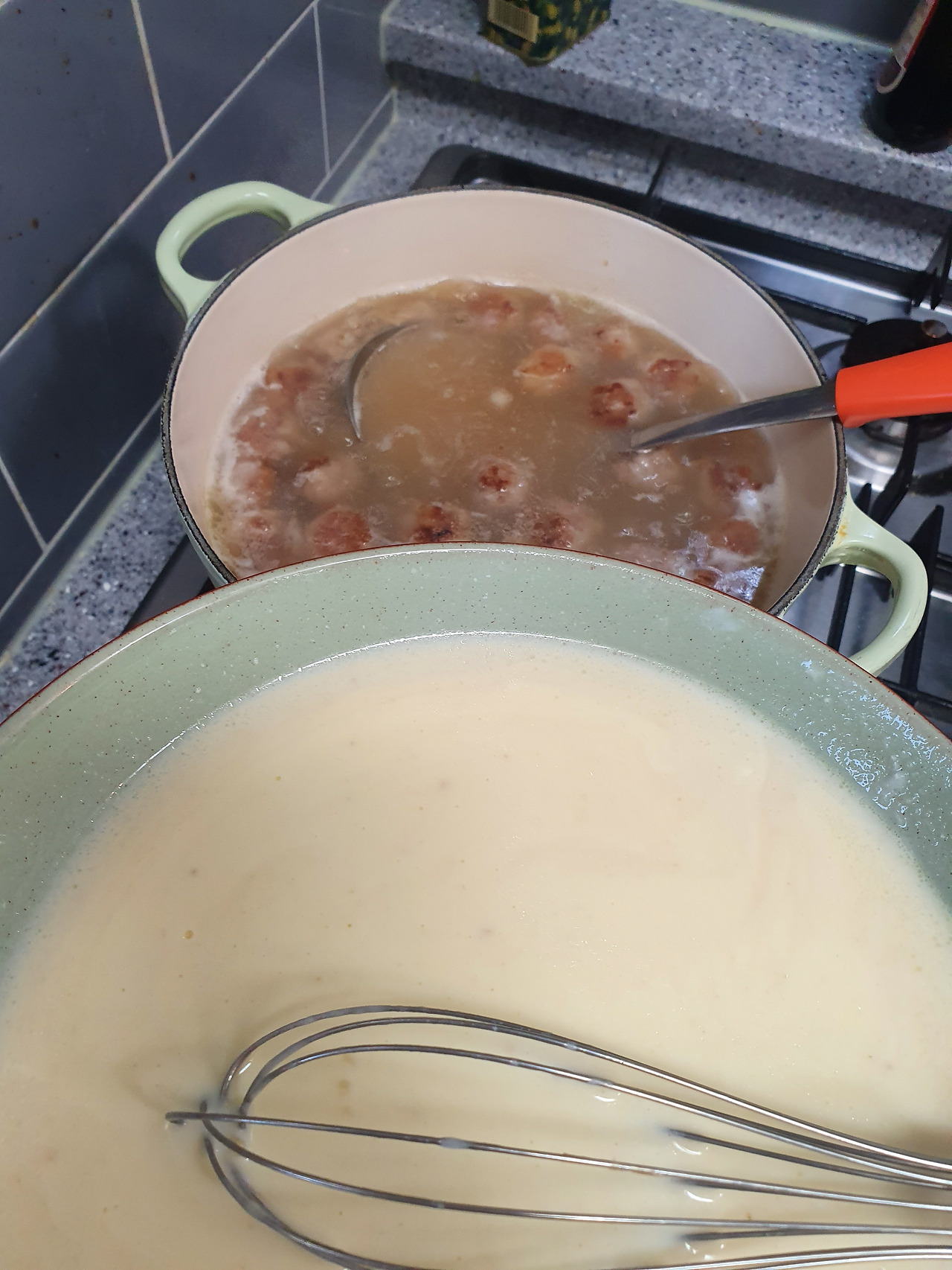 5. 물을 끓인 후, 팬에 익힌 고기공을 넣는다. 쌀과 병아리콩을 넣고, 쌀이 익을 때까지 끓인다.