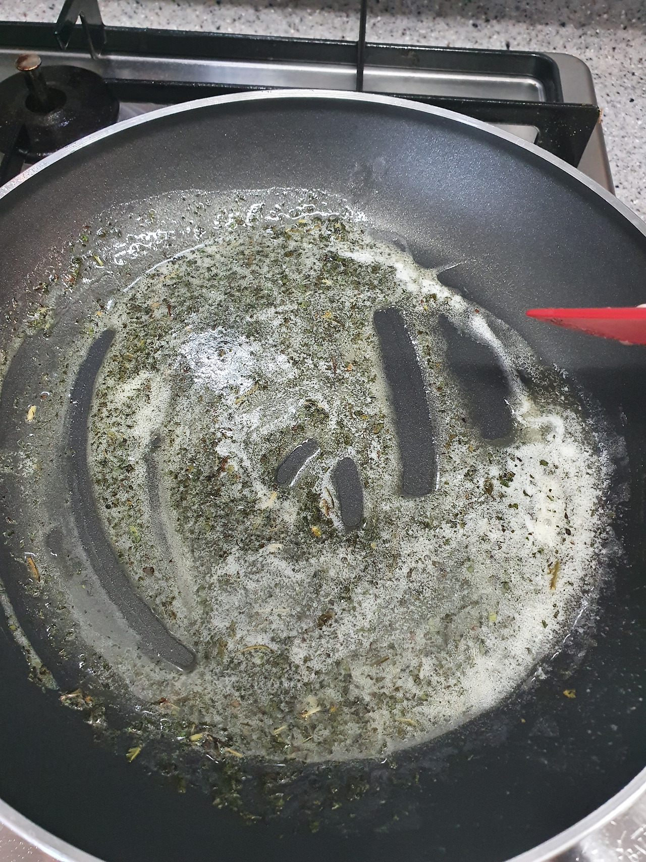 7. 약한 불로 달군 팬에 버터를 녹인 뒤, 민트를 넣어 1분간 저어서 민트 향이 버터에 배도록 한다.