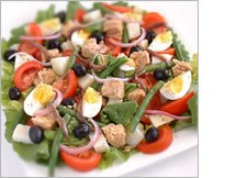 .참치, 앤초비, 삶은 계란, 토마토, 양상추, 그린빈, 올리브가 들어가는 포만감이 크고 상큼한 샐러드