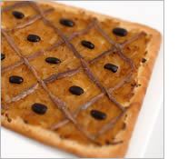 .프로방스 스타일의 피자. 카라멜라이즈한(caramelized)양파와 안초비, 올리브 등을 올린다.