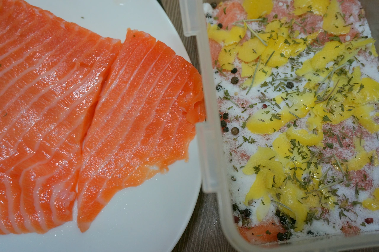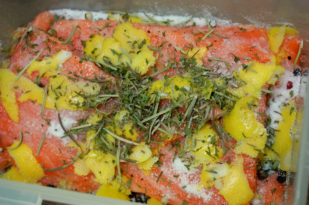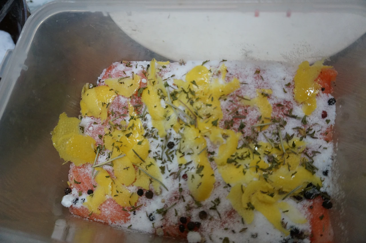 4) 냉장고에 담을 통 바닥에 소금과 설탕, 통후추, 레몬제스트, 딜을 비롯한 허브를 올리고 그 위에 연어 덩어리를 얹는다. 그 위에 다시 소금과 설탕 등을 동일하게 얹고 연어 덩어리를 얹고 그 위에 다시 소금 설탕 등을 덮는다.