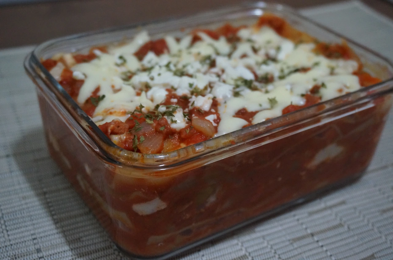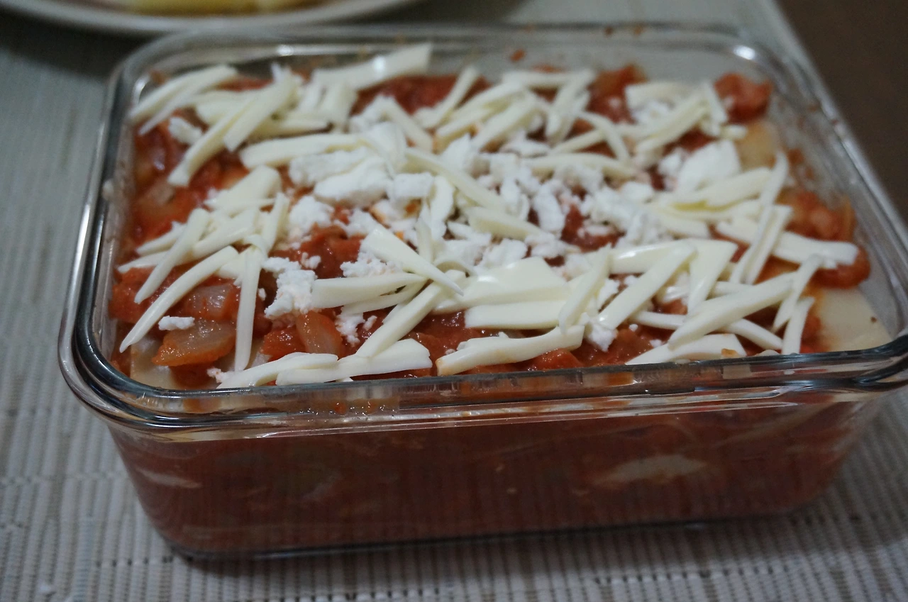 4. 그다음은 쌓기만 하면 된다. 적당한 사이즈의 용기에(오븐에 넣는다면 오븐용 용기에) 라구소스-베사멜소스-라자냐면-라구소스-베사멜소스-라자냐면-라구소스-베사멜소스-라자냐면-라구소스 이런 식으로 쌓는다. 맨 위에는 라구소스를 얹고 그 위에 준비한 치즈를 뿌린다.