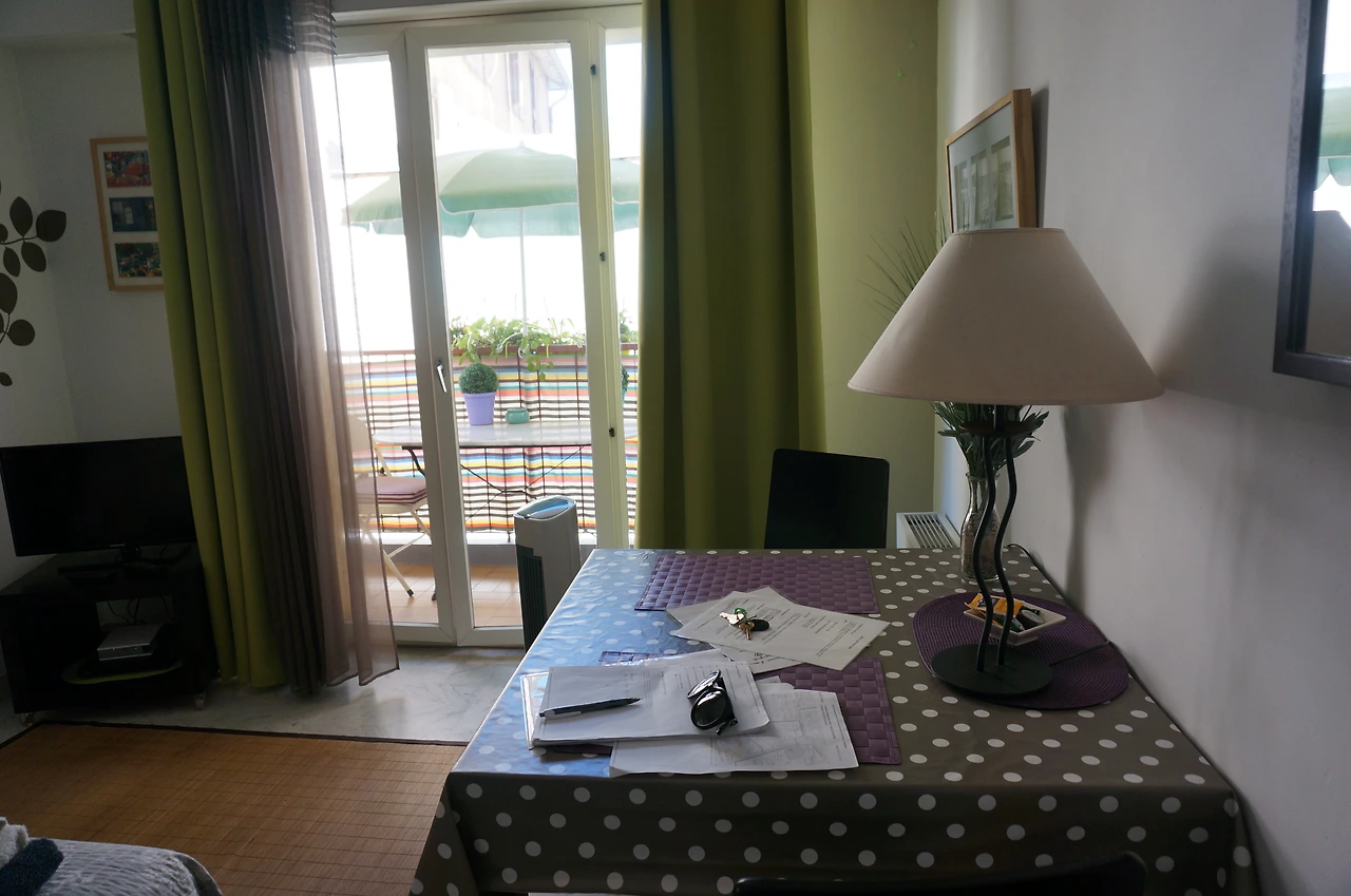 숙소는 마치 한국의 오피스텔과 똑같은 아담한 평수의 아파트로, 사이즈는 작아도 깔끔한 부엌과(드디어 요리할 마음이 생기는 깔끔한 부엌을 만났다!) 테이블이 있는 테라스, 작은 식탁과 DVD까지 갖추어져 있는 똘똘한 곳이었다. 무엇보다 보라색과 연두색 베이스의 귀여운 인테리어가 마음에 쏙 들었다.