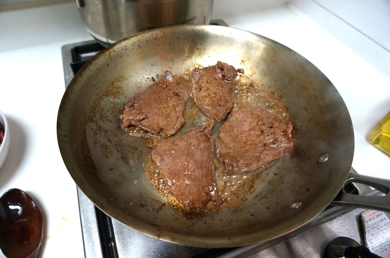 팬에 묻은 갈색 육즙은 타지 않게 잘 지켜보았다가 씻어내지 말고 사용한다.