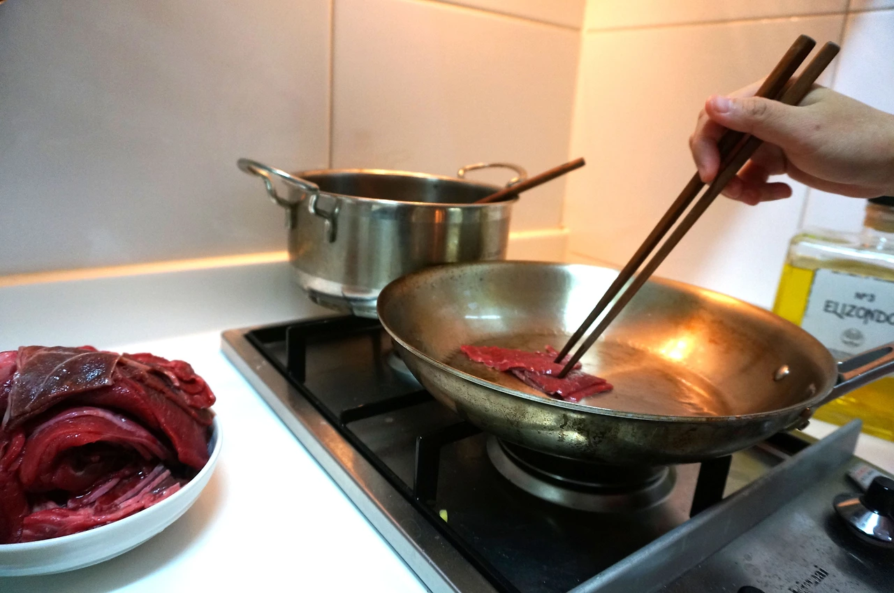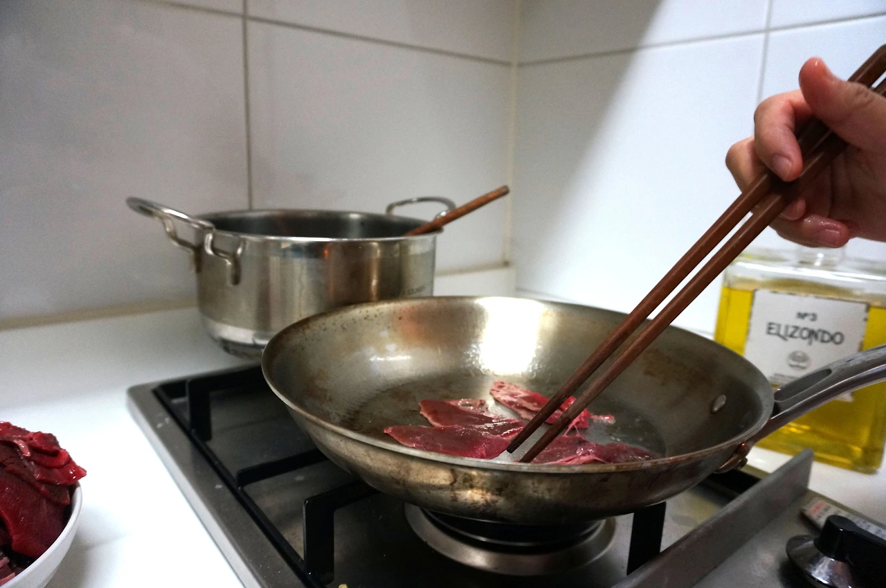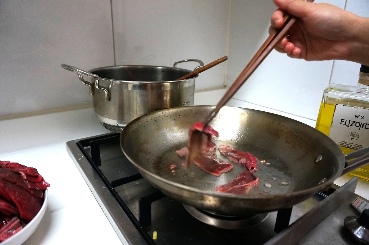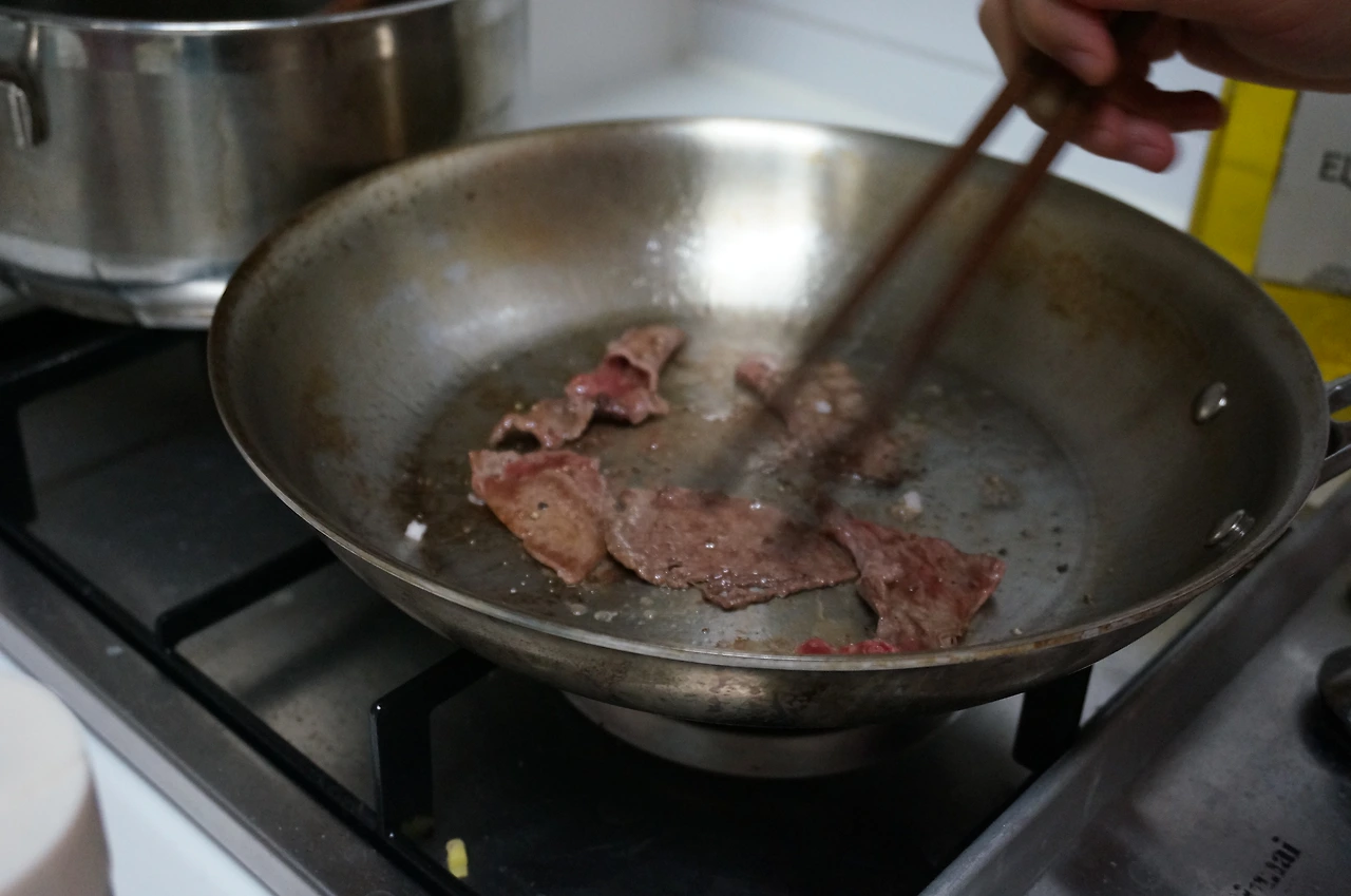 기름을 두른 팬에 소고기를 몇 조각 먼저 굽는다. 그 이유는 앞으로 만들어질 육수에 육즙을 더하기 위해서이다.