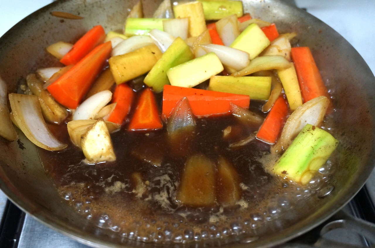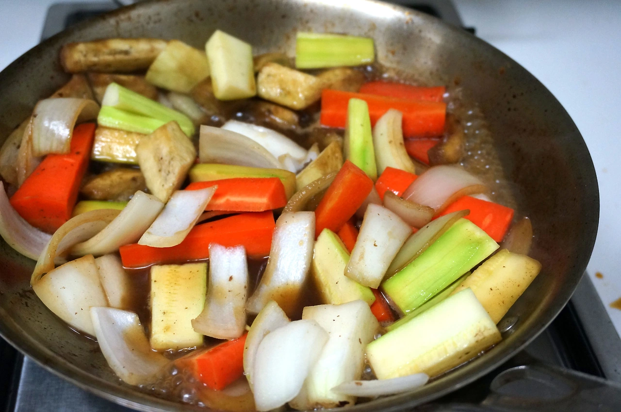 3. 팬에 손질한 채소와 와리시타를 넣고 채소 익히기.