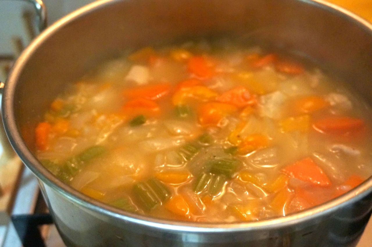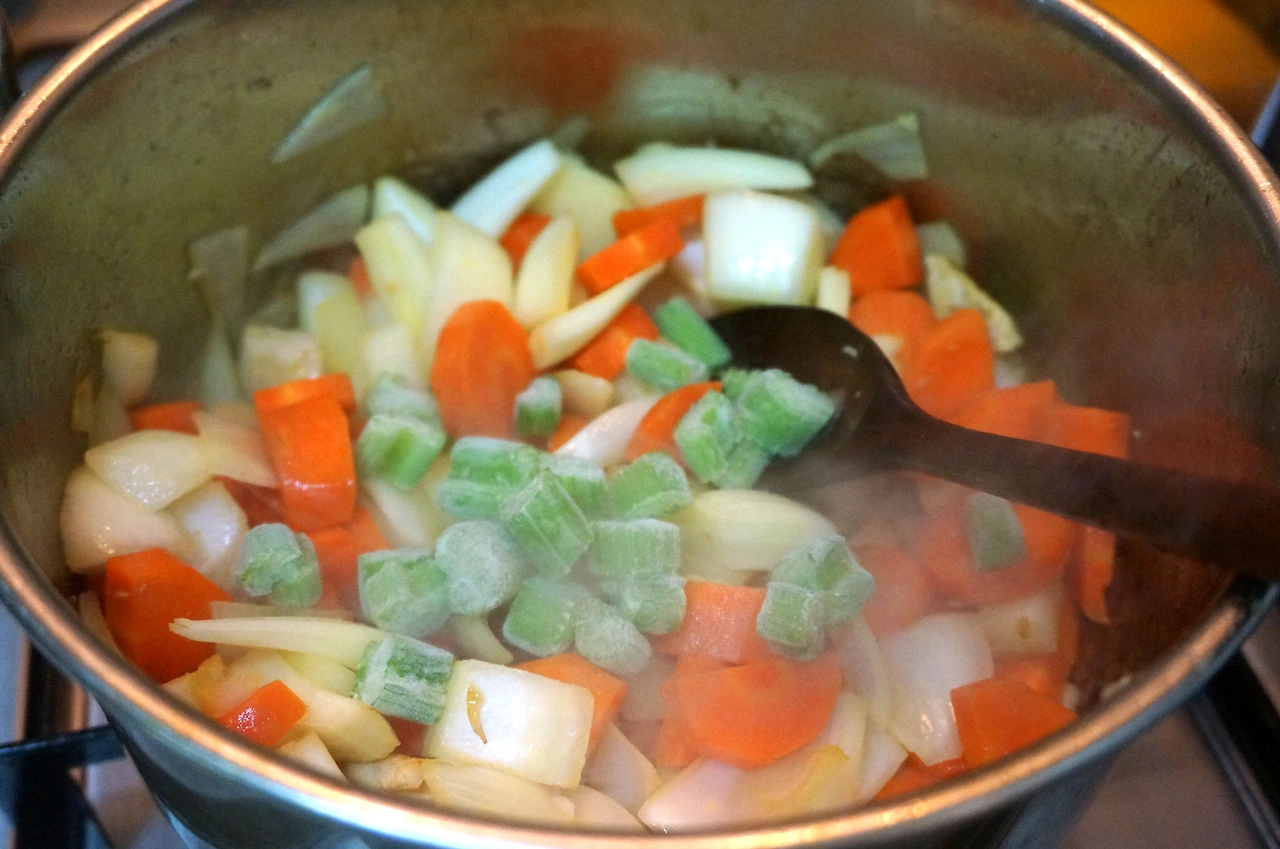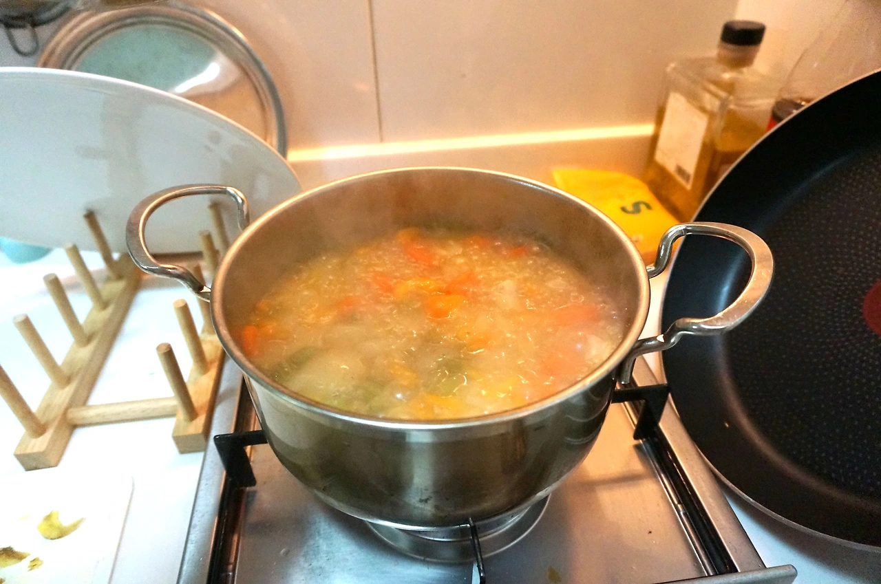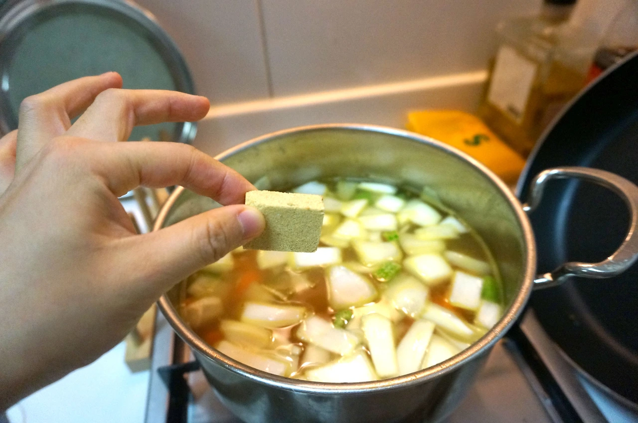 4. 야채가 완전히 익지는 않은 상태에서 냄비에 물을 붓고 치킨스톡을 넣고 끓인다. 내가 사용한 것은 역시나 요리 좀 좋아하는 자취인의 필수품 고형 치킨스톡.