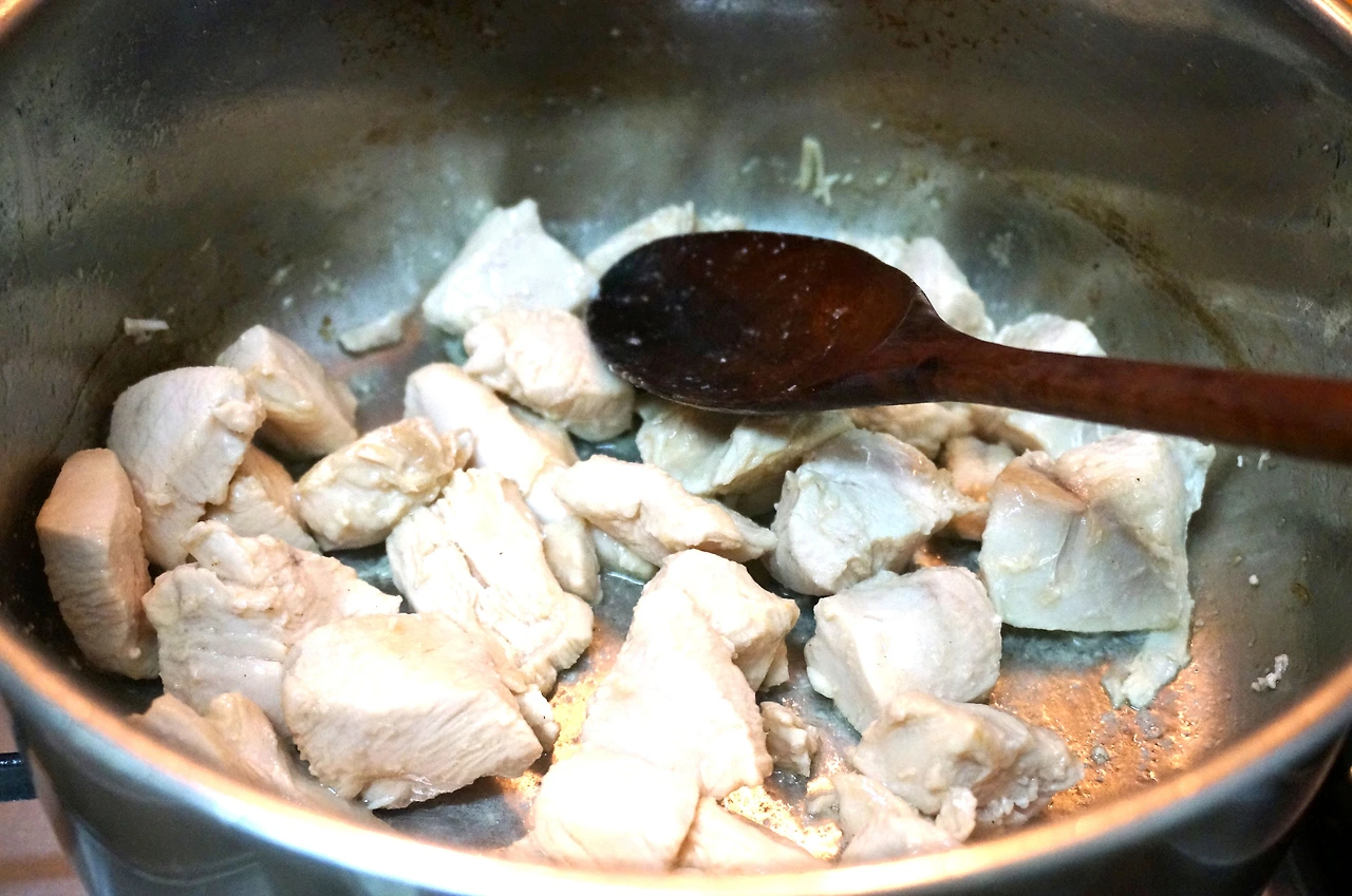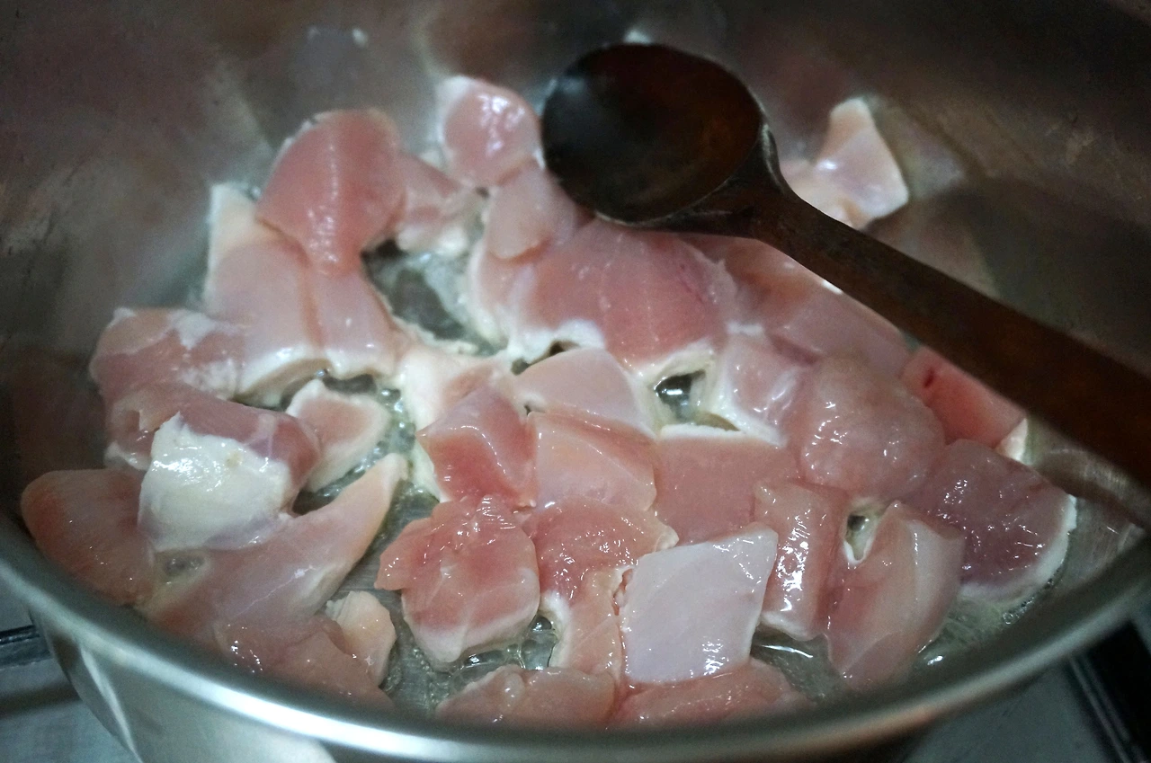 2. 깍둑썰기한 닭을 올리브유를 두른 냄비에 볶는다.
