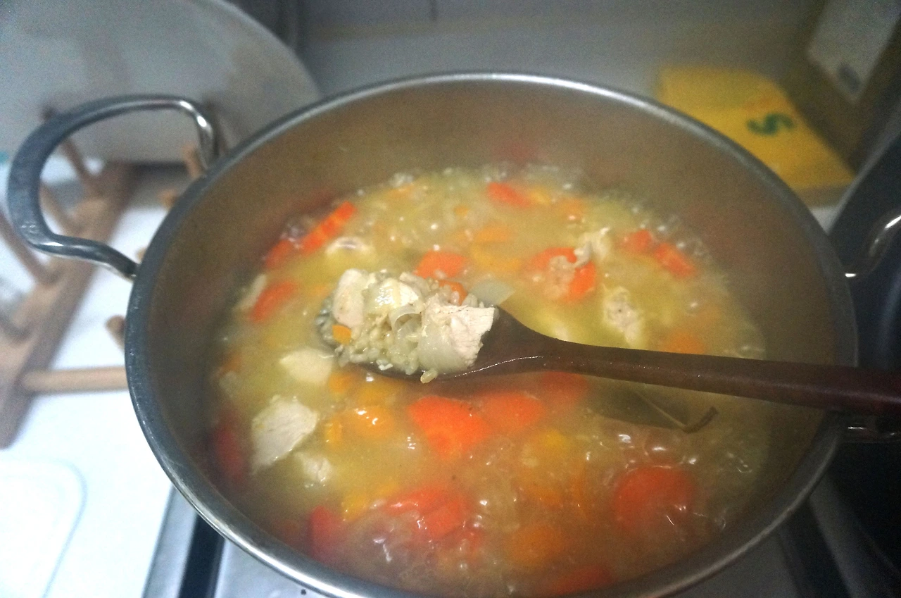6. 이제 따로 덜어둔 닭고기도 냄비에 도로 넣은 후에 뚜껑을 덮고 20~30분간 부드럽게 끓여주는데, 끓이는 시간의 기준은 아무래도 쌀이 익는 기준이다.