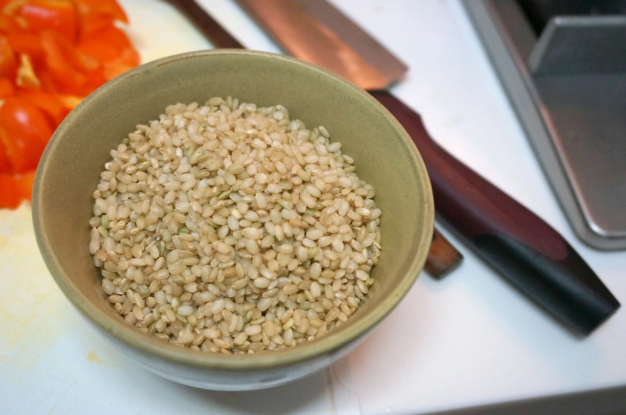 5. 야채를 넣으면서 쌀도 동시에 함께 넣어준다. 생쌀을 넣어주면 되는데, 나는 그리스인처럼 쿨하게 포장을 뜯은 그대로 촤라락 부을 수는 없어서 흐르는 물에 살짝 헹구고 넣었다.